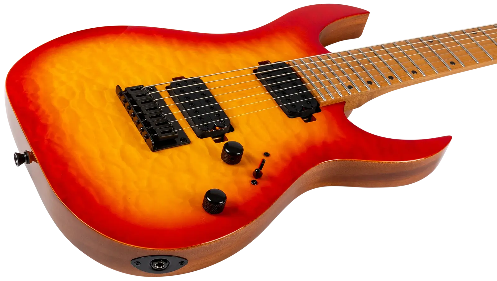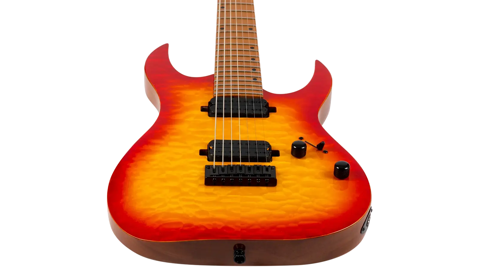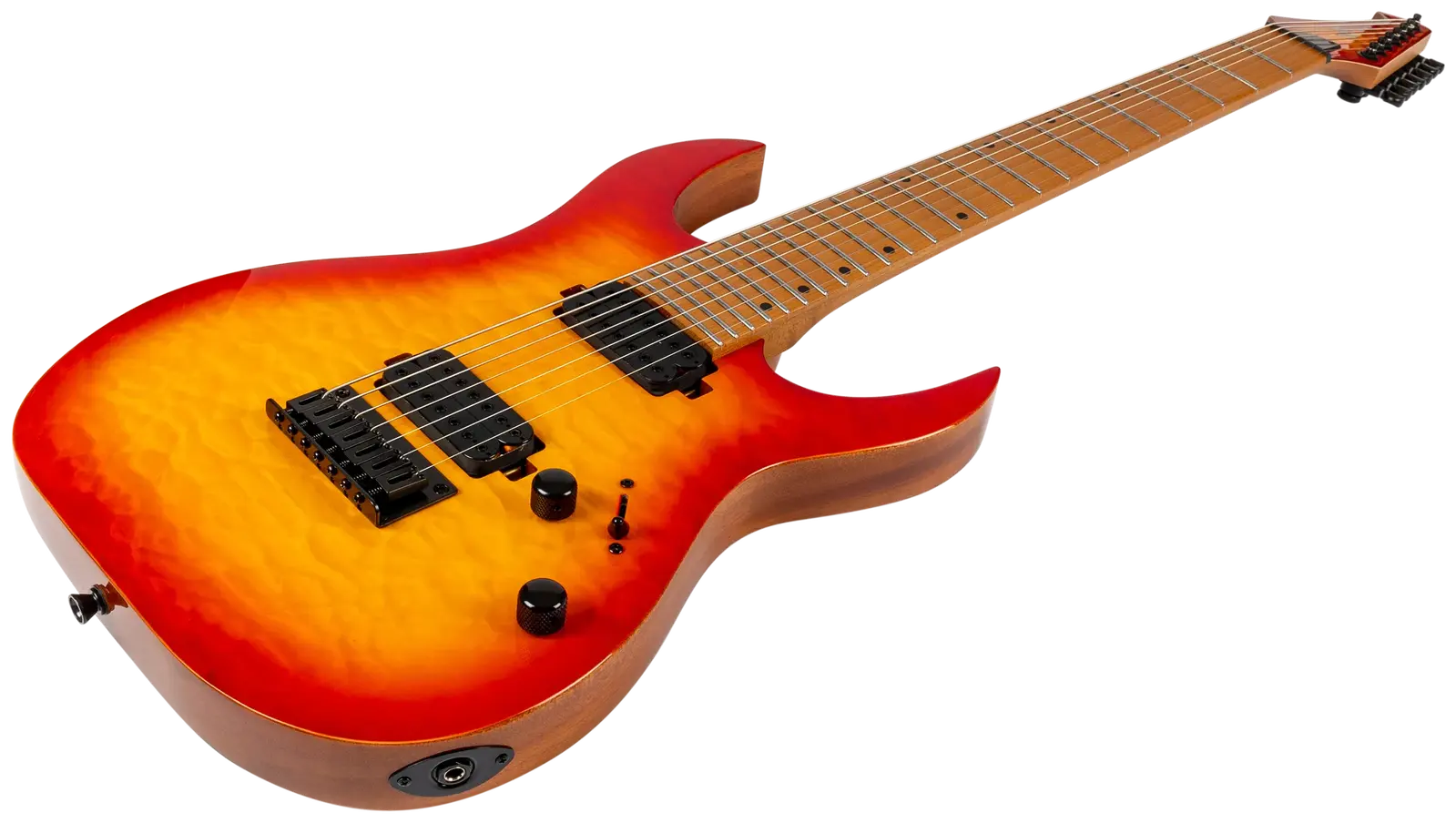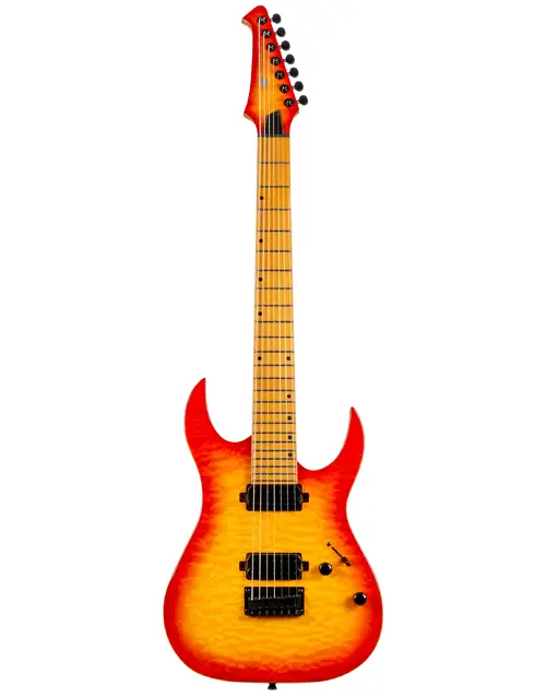 The Spira Guitars S-507 7-String Quilt Top Electric Guitar stands at the peak of the Spira seven-string lineup, crafted for players who demand uncompromising performance and aesthetics. Featuring a mahogany body with quilted maple top, the S-507 offers exceptional resonance and striking visual appeal. Its Canadian roasted maple neck and fretboard ensure unmatched stability and a smooth, responsive playing experience, making it ideal for advanced techniques.
