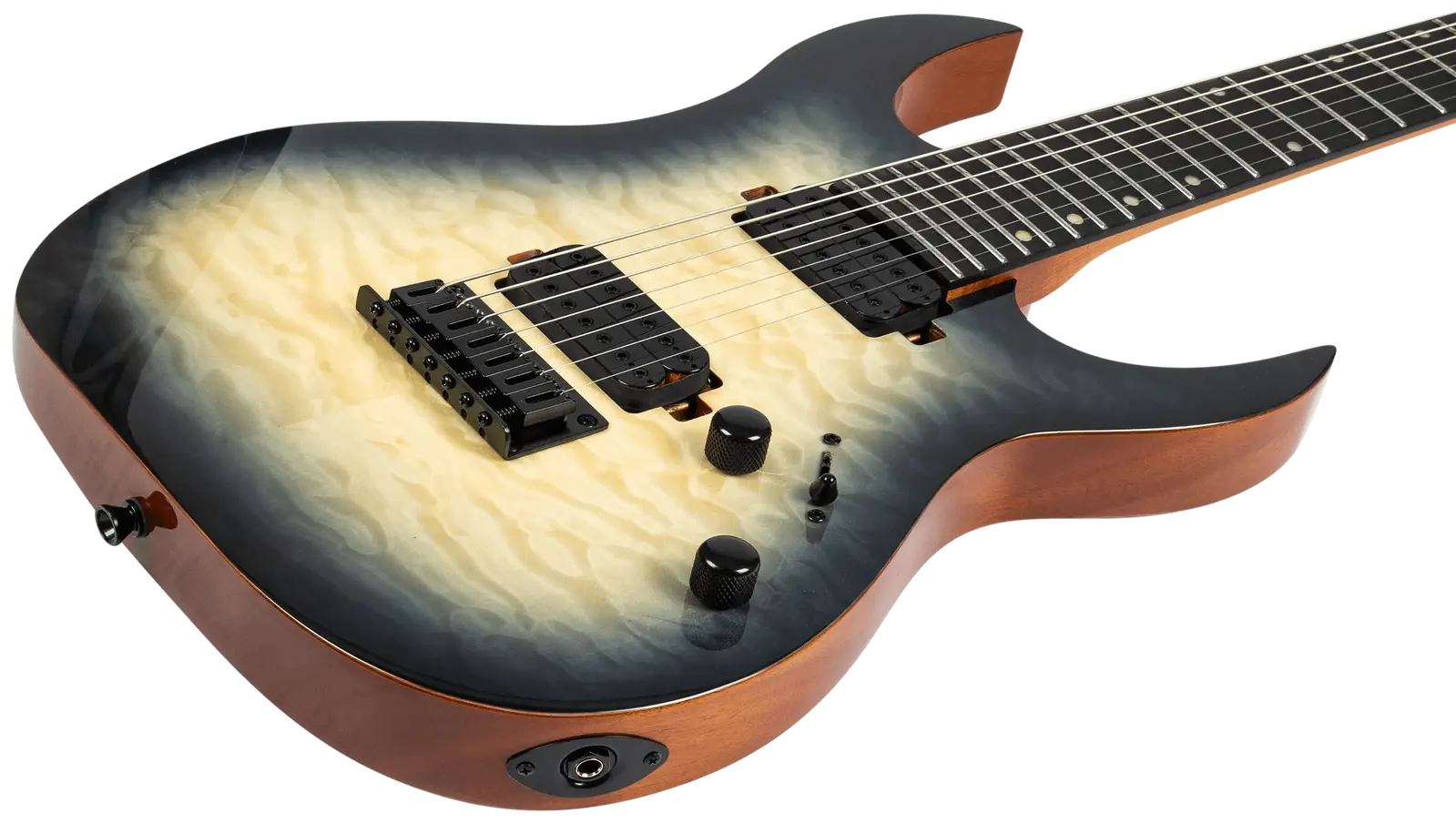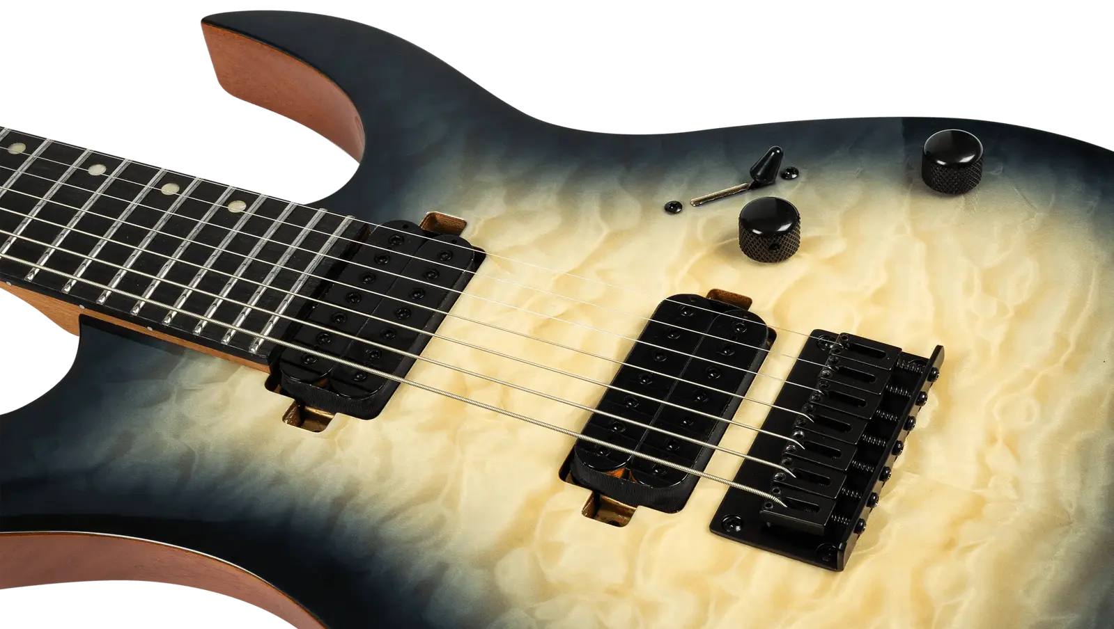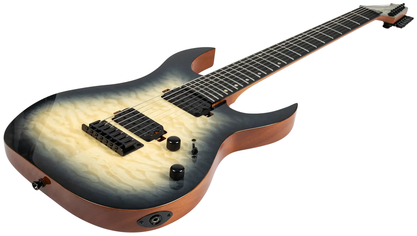 The Spira Guitars S-507 7-String Quilt Top Electric Guitar stands at the peak of the Spira seven-string lineup, crafted for players who demand uncompromising performance and aesthetics. Featuring a mahogany body with quilted maple top, the S-507 offers exceptional resonance and striking visual appeal. Its Canadian roasted maple neck and ebony tech fretboard ensure unmatched stability and a smooth, responsive playing experience, making it ideal for advanced techniques.