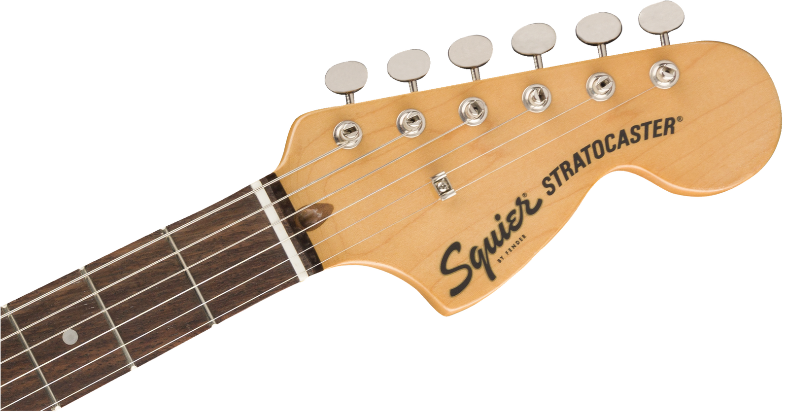 A tip of the hat to the large-headstock Strat models produced in the 1970s, the Classic Vibe '70s Stratocaster creates incredible tone courtesy of a trio of Fender-Designed alnico single-coil pickups. Player-friendly features include a slim and comfortable "C"-shaped neck profile with an easy-playing 9.5"-radius fingerboard and narrow-tall frets, as well as a vintage-style tremolo system for expressive string bending effects. This throwback Squier model also features 1970s inspired headstock markings, nickel-plated hardware and a slick vintage-tinted gloss neck finish for an old-school aesthetic vibe. Features. 100% designed by Fender Inspired by 1970s-era Stratocaster models Fender-Designed alnico pickups Vintage-tinted gloss neck finish Nickel-plated hardware Period-correct headstock markings