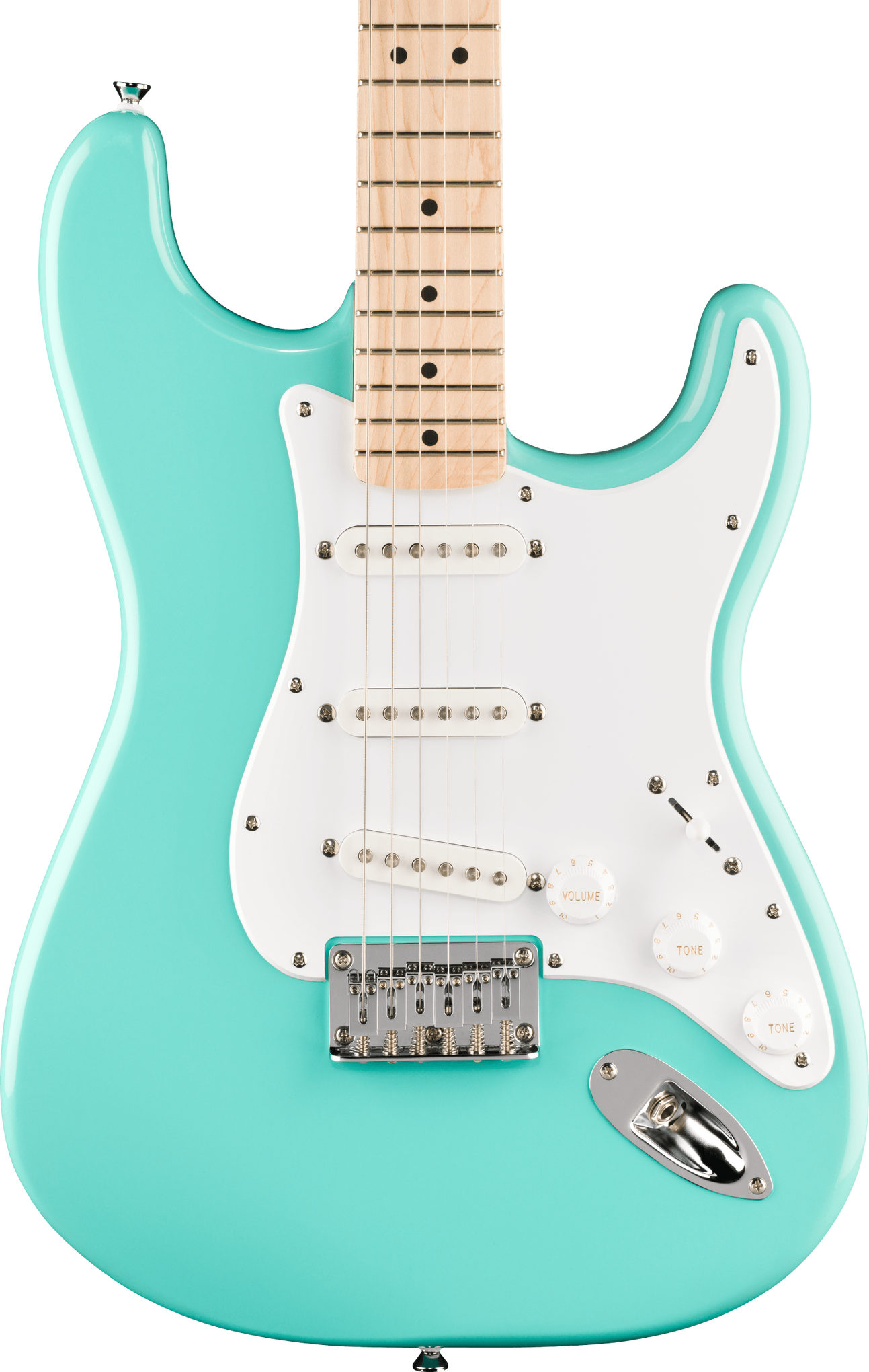 Three ceramic single-coil pickups deliver bright, articulate tones across all five switch positions, covering clean rhythms, edge-of-breakup sounds, and sharper lead voices. The six-saddle hardtail bridge provides a fixed, solid feel that suits players who prefer consistent tuning and direct string response over tremolo movement. Sealed die-cast tuning machines and chrome hardware complete a simple, low-maintenance setup.