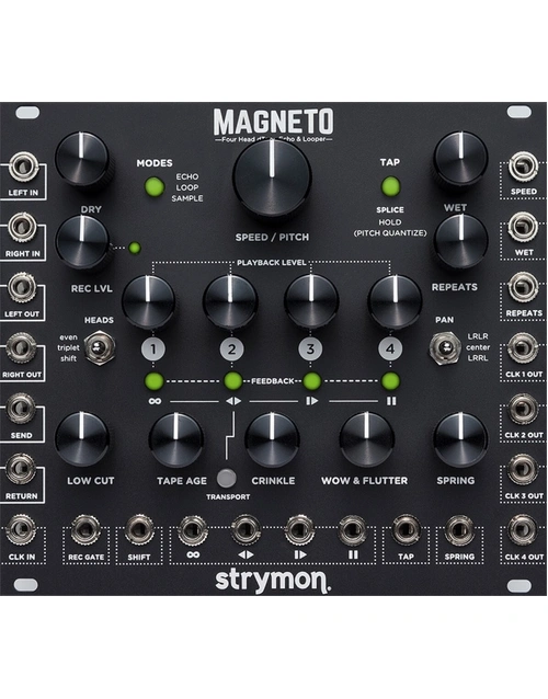 Create expansive soundscapes and evolving, otherworldly tones. Add layers upon layers of harmonic and rhythmic complexity within an enveloping stereo field. Infuse your rack with vintage warmth and retrofuturistic soul. Packed with powerful features while maintaining intuitive playability, the Strymon Magneto is a stereo multi-head tape delay that also functions as a looper, phrase sampler, vintage spring reverb unit, phase-aligned clock multiplier, chaotic oscillator, zero latency sub-oscillator and more, with extensive CV I/O.