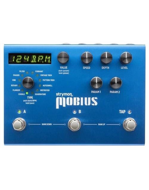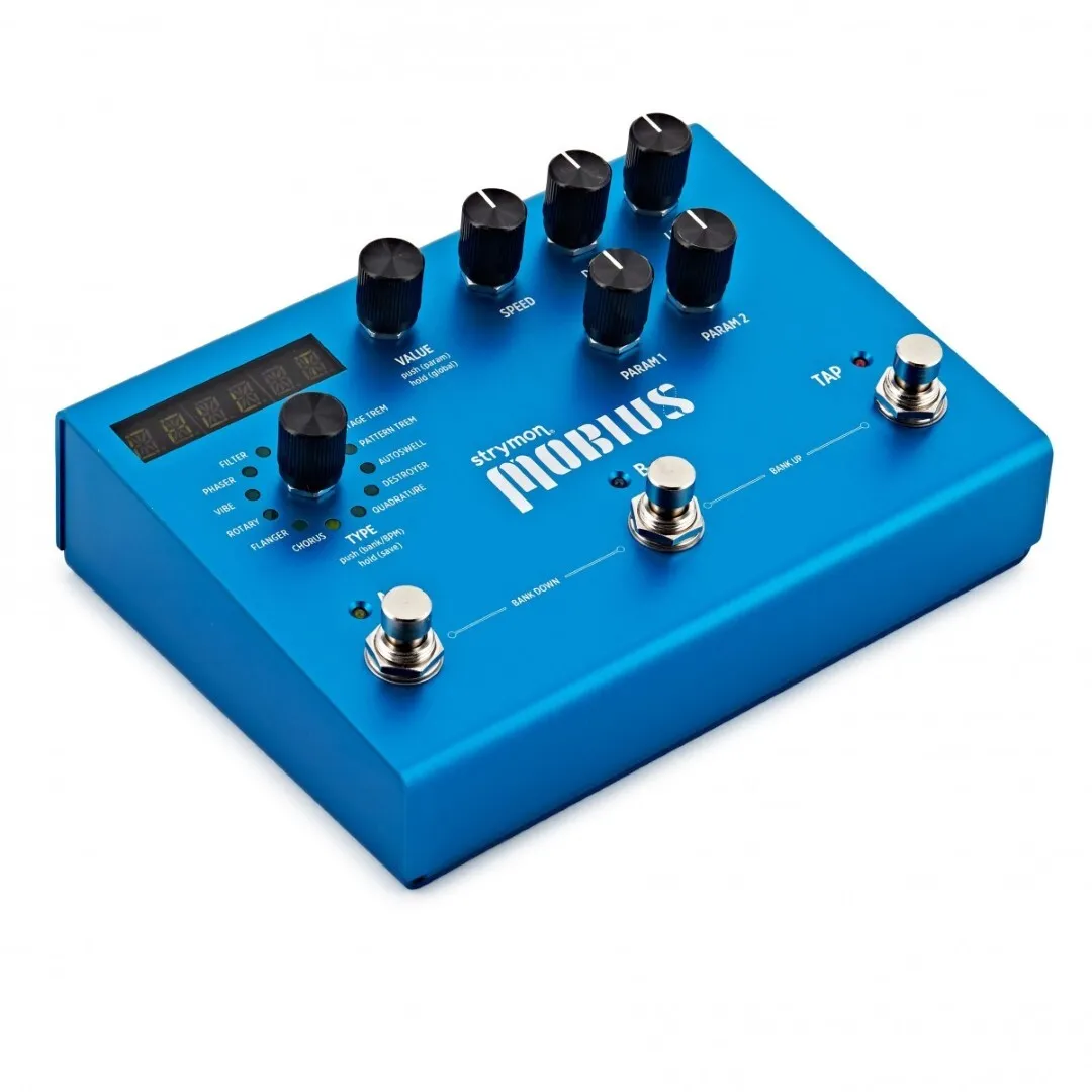 The Strymon Mobius gives you twelve legendary, versatile, and inspirational modulation machines, all in an easy-to-use package. Go from mouthwatering vintage chorus sounds all the way to syrupy psychedelic phasers. Get classic, pulsating tremolos all the way to warbling crushed bits. Mobius opens up the history books of music and provides new sounds and inspiration for all of your musical ideas.