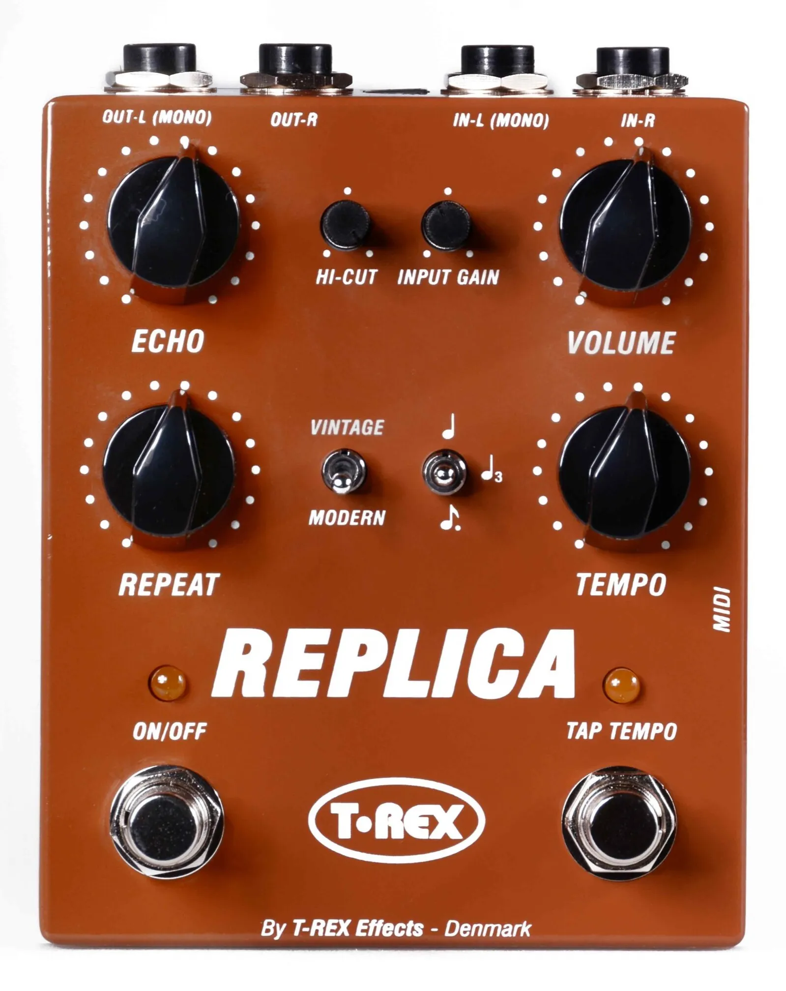 The fusion of analogue and digital worlds elevates this pedal's responsiveness and dynamics. While the core of the new Replica pedal is digital, the direct signal and feedback circuit are pure analogue - this allows for an immediate response and more dynamic sound. Embrace versatile note division options (quarter, triplet and dotted eights), editable via a division switch and tap tempo function. Other modern features not included in the original include MIDI options, bypass, MIDI-clock, and the convenience of standard 9 Volt DC supply (power supply not included).