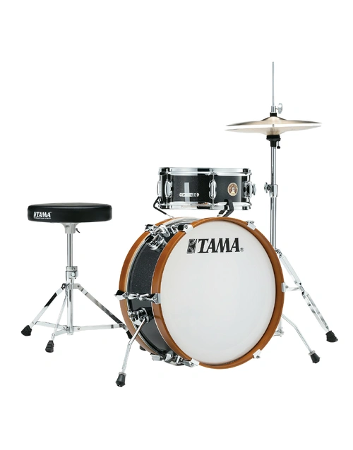 The Tama LJK28H4 CLUB-JAM Mini comes in a 2 piece shell kit in a 7"x18" Bass Drum & 5"x12" Snare Drum, Hi-Hat Stand, Drum Pedal, Snare Stand & Drum Throne configuration. Designed with 7mm, 8ply Mersawa / Poplar hybrid shell with a Bass Drum Wood Hoop, in compact sizes for easy transport.