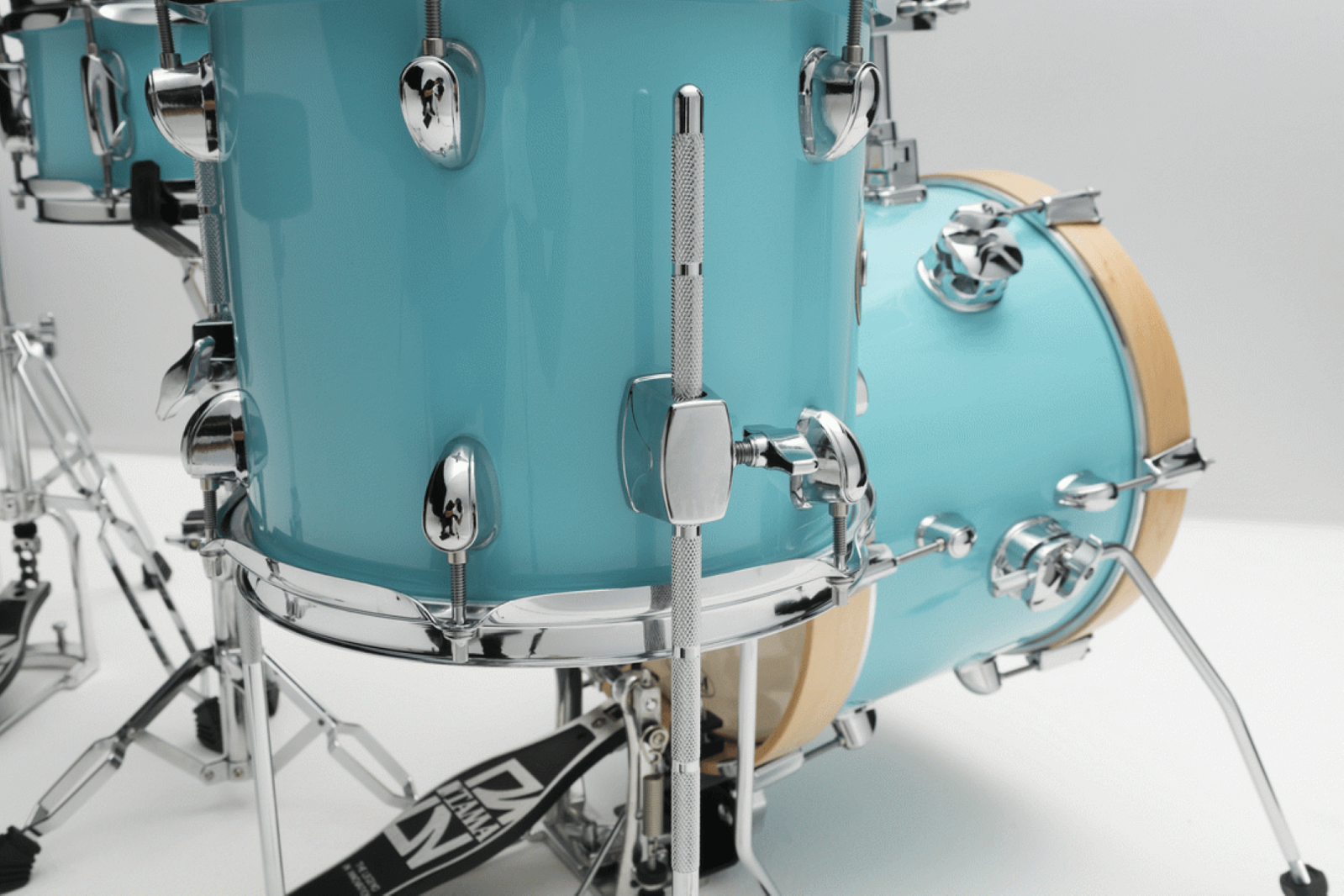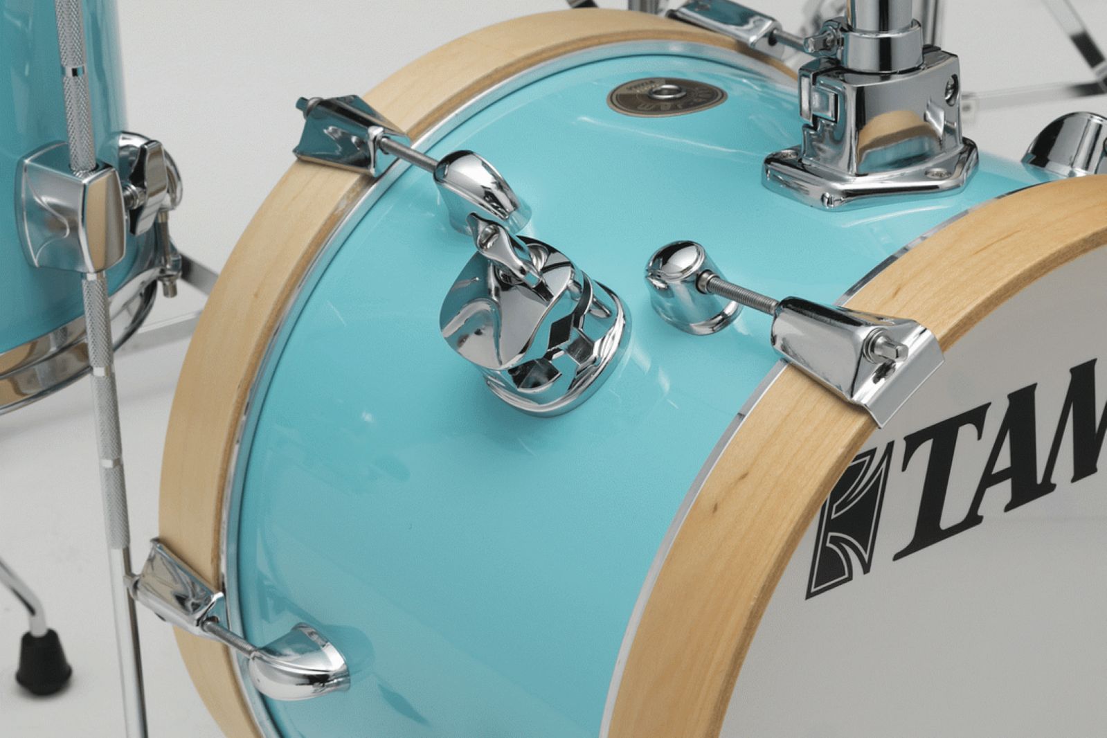 Thanks to its super-compact size, the Club-JAM Flyer is perfect for gigging musicians - with additional space saving features, such as curved bass drum spurs, and the optional CACLJ cymbal holder (sold separately) mounted directly on the bass drum, will fit comfortably on just about any size stage. A bass drum lift is also included to provide varied bass drum beater impact positioning. Finished in Aqua Blue, and complemented by natural wood hoops on the bass drum, this Club-JAM is sure to turn heads.