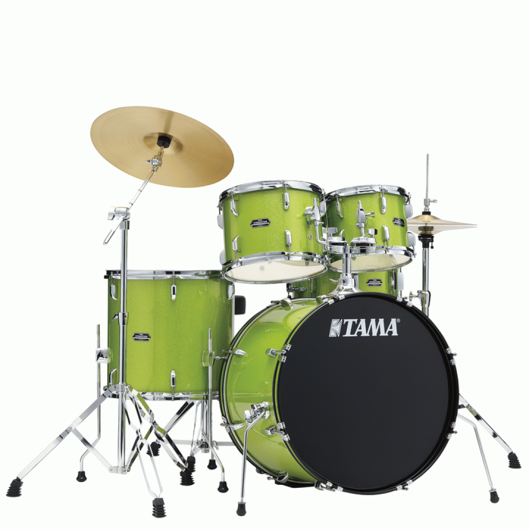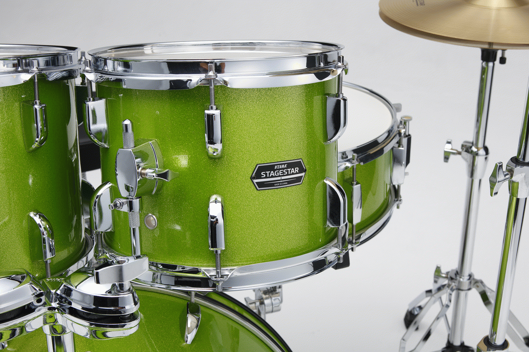 The Tama ST52H5C Stagestar Poplar 5-Piece Drum Kit in Lime Green Sparkle is a bold and exciting kit that is sure to get you noticed The shells are made of 100% poplar wood, which provides a warm and full sound. The kit comes with a set of cymbals, including a 14" hi-hat, and a 16" crash, as well as a 14" snare drum, 10" & 12" toms, and a 22" bass drum. All necessary hardware, like a kick pedal and stool, is included with the kit; the hardware is also high-quality and durable, making this kit a great value for the price.