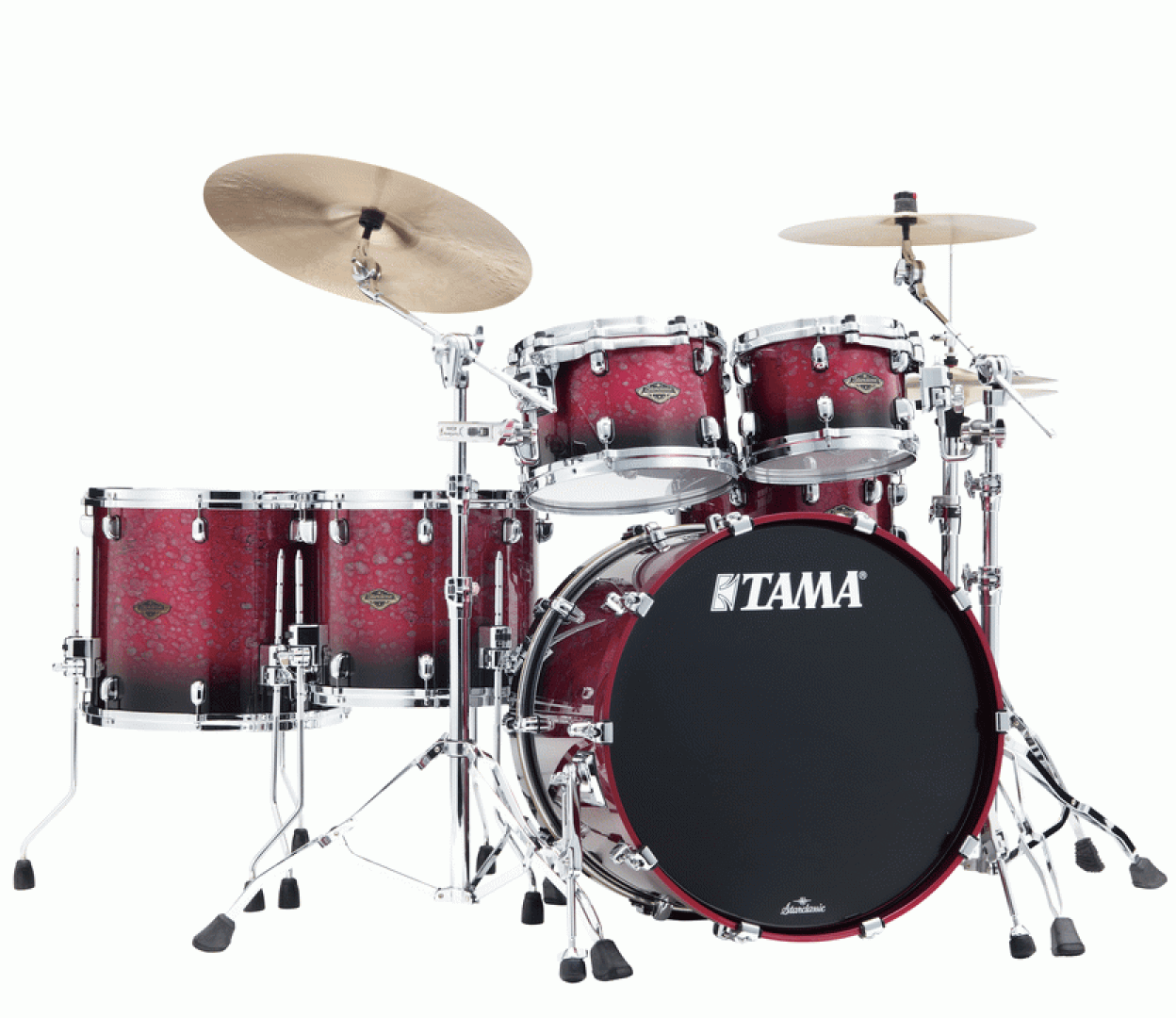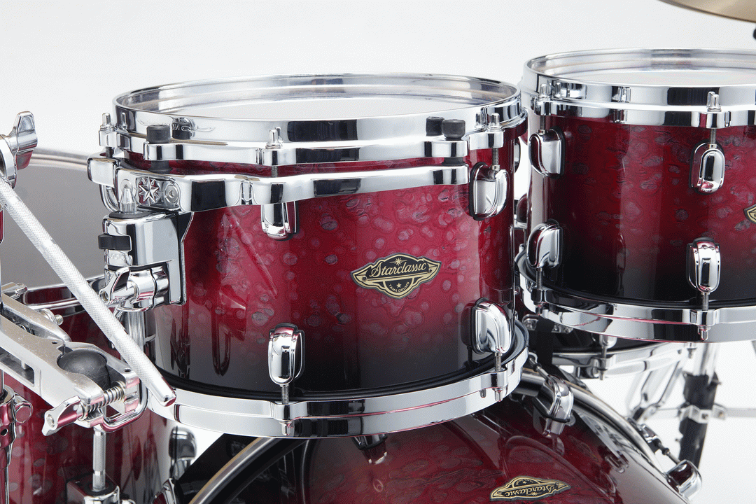 The Tama Starclassic Walnut/Birch 5-piece Shell Pack with 22" Bass Drum in Molten Dark Raspberry Fade is part of the 2019 DRUM KITS release in the Starclassic Walnut/Birch Series. Exploring limitless possibilities, Tama's result in the wake of countless experimentation came in the form of the Hybrid Shell Walnut/Birch: combining the superior quality warmth and mid to low frequency tone of the increasingly popular and truly unique Walnut, with the well-defined and uncompromisingly solid attack of Birch. Whilst Tama successfully preserved their unique sonic trademarks, the characteristics of both Walnut and Birch blend to persuade a very focused sound that would define itself with great distinction within a musical ensemble; married with controlled sustain and clarity; all sealed with an undeniably palpable feeling of warmth and resonance when performed.