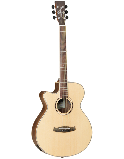 The range comes in dreadnought, folk, super folk and left hand models so you are sure to find the one to meet your needs! Our deluxe model features all ebony wood, super folk cutaway / electric, maple binding and a natural gloss finish.
