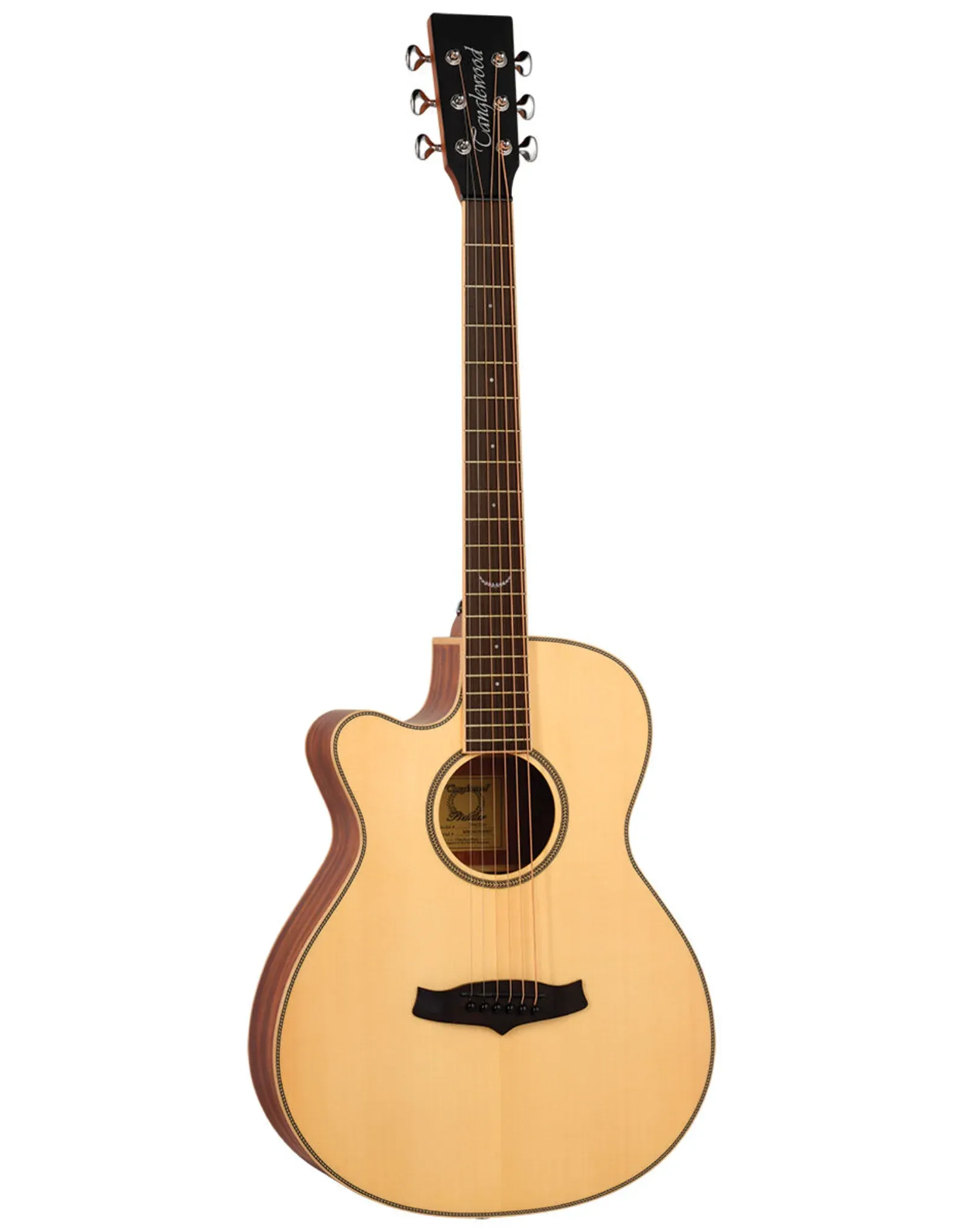 The Tanglewood TP4-CE-LH brings the versatility and elegance of the Premier Series to left-handed players. With a solid Engelmann spruce top and mahogany back and sides, this Super Folk cutaway delivers a detailed and balanced tone, ideal for a wide range of playing styles. The dark purple heart fingerboard features an olive branch inlay at the 12th fret, adding a refined visual touch. Equipped with a Fishman Presys preamp, it offers reliable amplified tone for live and studio use. A natural satin finish and premium case complete this left-handed performer’s package.