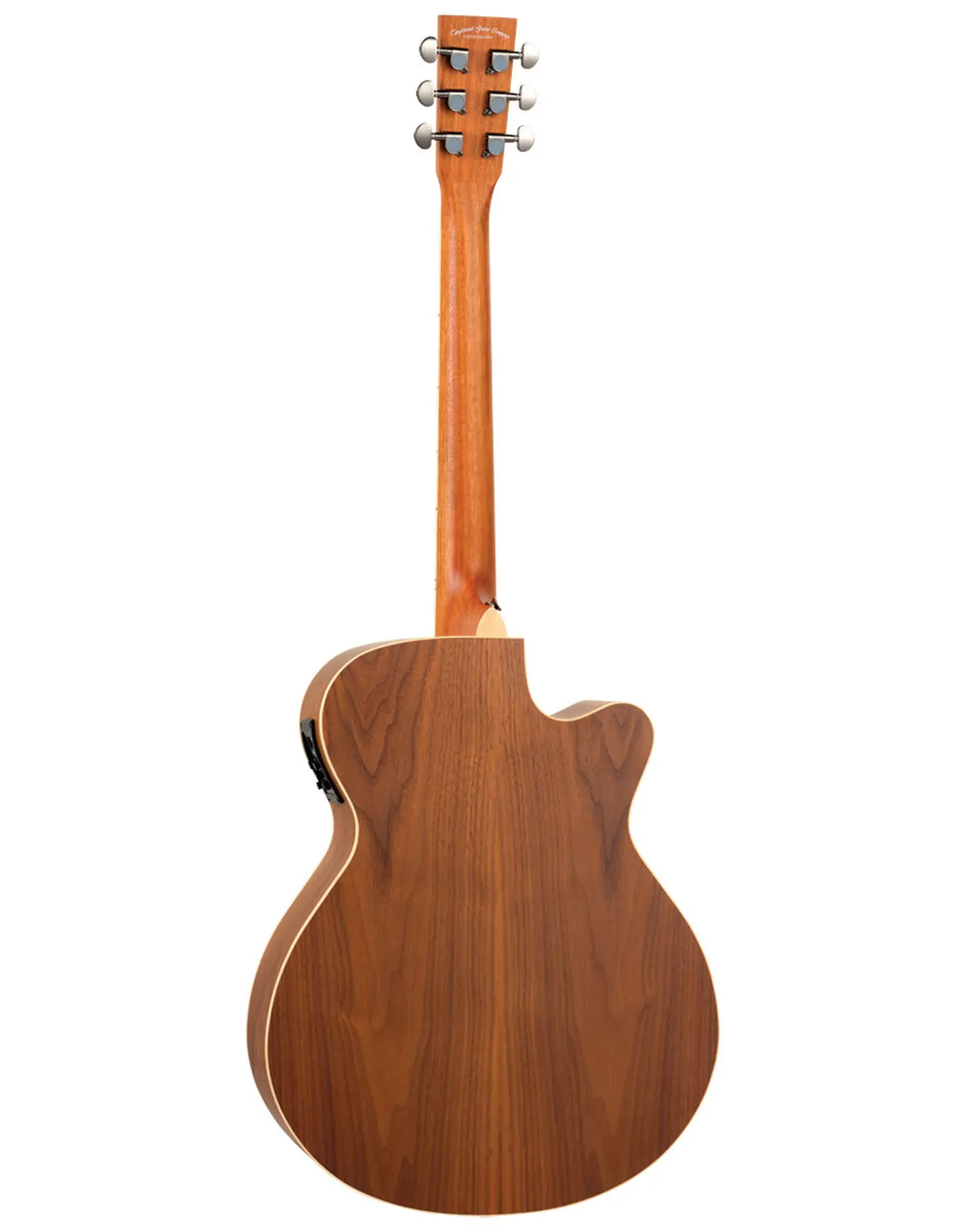 The Tanglewood TRU4-CE-AW-LH Reunion Pro Super Folk is a versatile acoustic-electric guitar designed for players who seek a balance of comfort, projection, and rich tone. Featuring a solid spruce top with a figured black walnut veneer, it delivers bright, articulate highs with warm, resonant mids and bass. The black walnut back and sides enhance tonal depth and add striking visual appeal. The super folk cutaway body ensures a comfortable playing experience while offering excellent projection for both fingerstyle and strumming. Equipped with the Tanglewood Premium Plus EQ system, this guitar provides dynamic, natural-sounding amplification with onboard tone-shaping controls. Finished in natural satin with elegant herringbone inlay binding and snowflake fret inlays, the TRU4-CE-AW-LH is a stunning blend of premium craftsmanship and modern performance.