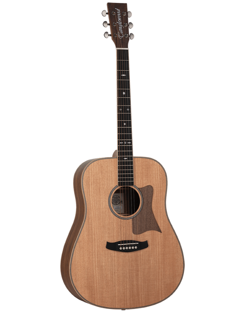The Tanglewood TRU5-HR Reunion Pro Dreadnought Solid Top guitar is part of the Reunion Pro series, which represents the pinnacle of Tanglewood's craftsmanship, drawing on the most beloved features of their instruments from the past decade. It features solid wood tops from the Evolution 1-4 range, delivering an immediate warm and rich tone that sets it apart visually and sonically. Adding a touch of elegance, Australian Red Cedar veneer is sourced for a special veneer on top of the solid top. Crafted with exotic hardwoods from the Discovery Exotic series, the contrasting back and sides perfectly complement the warm soundboard. Signature Herringbone detailing and snowflake inlays from the award-winning Sundance guitars elevate its visual appeal with an exclusive and premium touch. The Reunion Pro series seamlessly integrates these popular features, resulting in an instrument that captures the essence of Tanglewood's craftsmanship over the past decade.