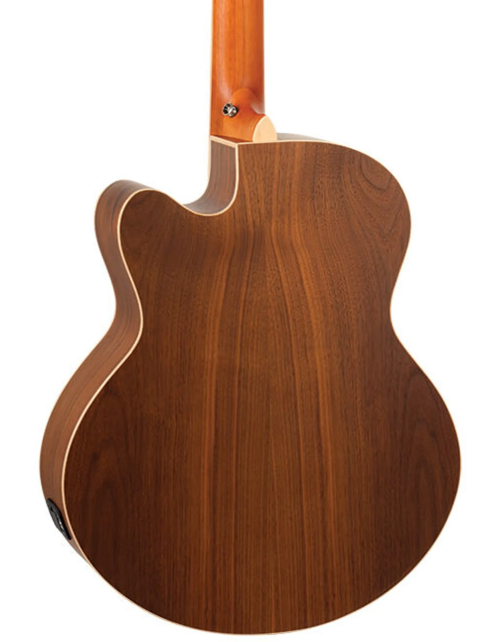 A solid spruce top provides articulation and dynamic range, while figured black walnut back and sides add warmth and depth to the overall tone. This combination keeps notes clear while maintaining a full, rounded low end that sits well in a mix.