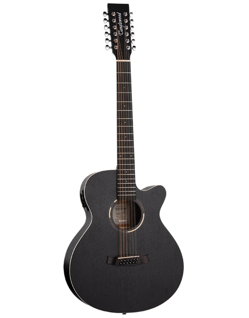 The Tanglewood TWBBSFCE12 Blackbird 12-String Super Folk is a beautifully crafted electro-acoustic designed for rich, resonant sound. Featuring a hand-selected mahogany top, back, and sides, this guitar produces a warm, balanced tone with clear highs and a tight low-end. The super folk cutaway body enhances comfort and accessibility for intricate playing. Equipped with the Tanglewood Premium Plus EQ system, it delivers natural, stage-ready amplification. The Smokestack Black Satin finish, complemented by vintage ivory ABS binding, gives it a timeless, vintage aesthetic reminiscent of classic 1940s and 50s American guitars.