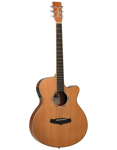 The Tanglewood TWPRO4-CE-NAS pairs premium tonewoods and modern electronics in a sleek, performance-ready Super Folk Cutaway body. A solid AA grade cedar top delivers a rich, warm tone with great responsiveness, while mahogany back and sides enhance resonance and depth. The natural satin finish offers a smooth, understated aesthetic, and the slim body shape ensures comfortable playability. With Elixir strings and Tanglewood’s Premium Plus EQ system onboard, this guitar is stage- and studio-ready.