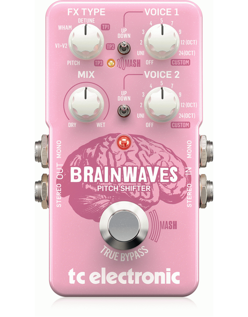 With its mind-bending range and kaleidoscopic pitch effects, the studio-grade BRAINWAVES PITCH SHIFTER is the perfect fusion of brains and brawn. This pink-clad pitch professor masters a variety of polyphonic effects including whammy and detune, plus a bunch of others – thanks to the dedicated TonePrint app. The award-winning MASH footswitch packs expression pedal performance into a pedalboard-friendly size.