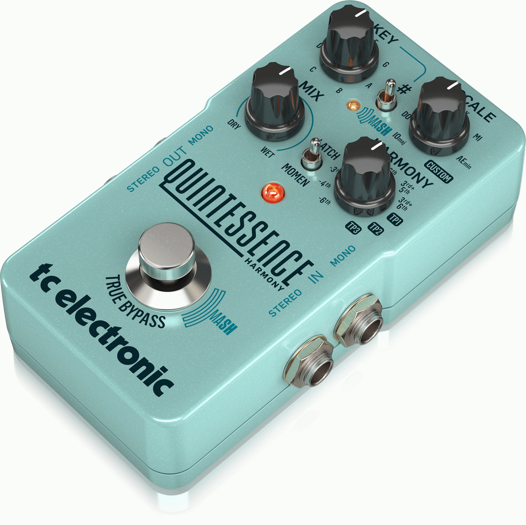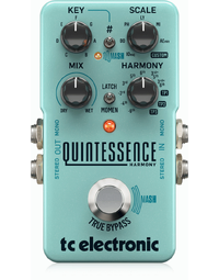 The TC Electronic Quintessence Harmony is an Exceptional Dual-Voiced Intelligent Harmonizer with Groundbreaking Pressure-Sensitive MASH Footswitch. Groundbreaking MASH technology turns the Quintessence's footswitch into a pressure-responsive expression controller, letting you easily pitch-bend harmonized notes up to the next interval. Choose between latching and momentary footswitch modes for perfect integration with your playing style.