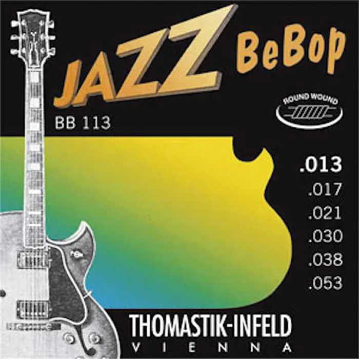 Thomastik BB113 Bebop Roundwound Medium Light 13-53 Electric Guitar Strings are probably the only round wound guitar string that can truly be called a jazz string. A similarity to the JAZZ SWING in materials and string architecture, but with a small gauge round wound nickel winding, produces a strong, fundamental rich jazzy tone that is somewhat bigger than a flat-wound. This remarkable string is an excellent alternate choice for the player wanting real jazz tone, but with a bit more of an "edge". High strings (e, B) are brass plated plain steel, low strings (G, D, A, E) are nickel roundwound.