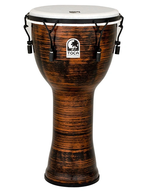 Toca's Freestyle II Djembes are the ideal travel companion. Their weather resistant synthetic shells are durable and lightweight. Because the all weather synthetic heads do not stretch or dry, they never lose their pitch. Freestyle II Djembes sound fantastic. The shell and head combination produces high, crisp slaps and deep bass tones allowing a wide range of playing styles. A protective non-slip rubber bottom makes the Freestyle II perfect for outdoor drumming. The mechanically tuned djembes come with a convenient tuning wrench.