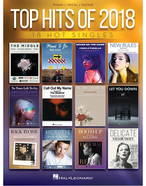 18 of the best from '18 are included in this collection for piano, voice and guitar. Includes: Back to You (Selena Gomez) • Boo'd Up (Ella Mai) • Call Out My Name (The Weeknd) • Delicate (Taylor Swift) • Heaven (Kane Brown) • In My Blood (Shawn Mendes) • Let You Down (NF) • Meant to Be (Bebe Rexha feat. Florida Georgia Line) • The Middle (Zedd, Maren Morris & Grey) • Never Be the Same (Camila Cabello) • New Rules (Dua Lipa) • No Tears Left to Cry (Ariana Grande) • and more.