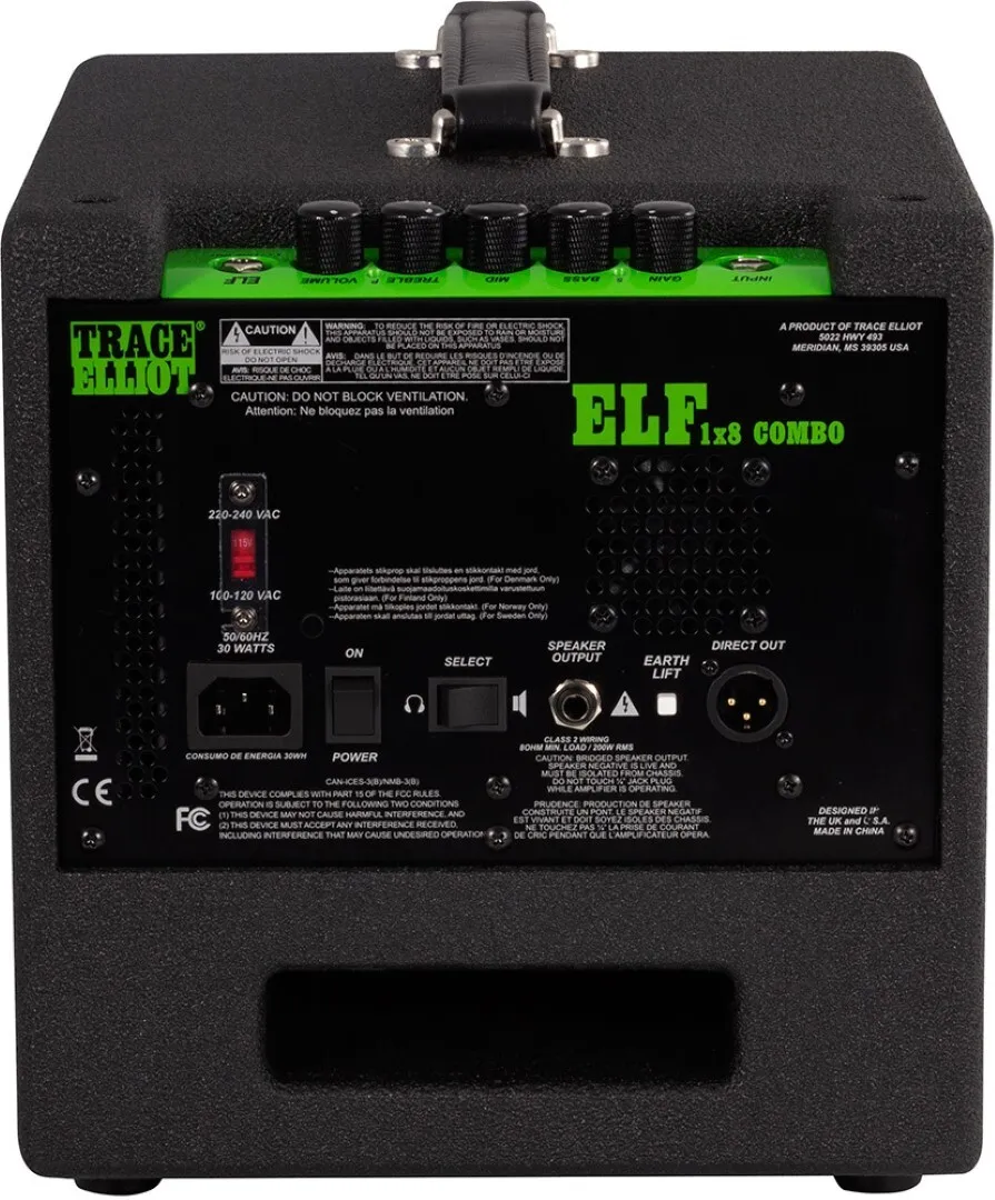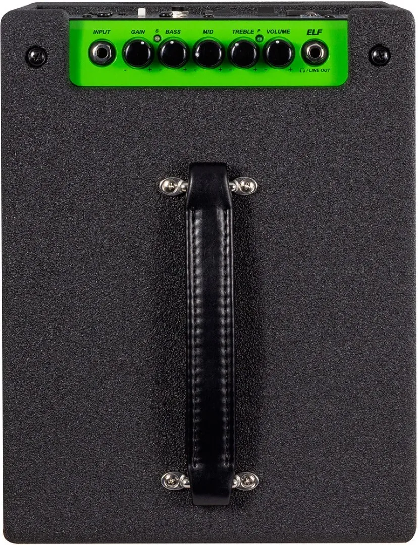 The Elf offers a solid, fan-cooled 200 W RMS at 4 ohms impedance. The control panel has plenty of options, including a wide-range input gain control with signal-level indicator and 3-band rotary equalizer that emulates the response of classic Trace Elliot multi-band graphic EQ filters. Ultra-high pre-amp input impedance, at more than 10 mega ohms, provides maximum sensitivity when using passive pickups, while the post EQ balanced XLR DI output with ground lift sends classic Trace Elliot tone to a mixing console or recording device. A 1/4" headphone output allows for quiet practice.
