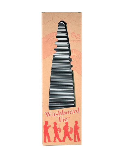 The Trophy Metal Musical Washboard Tie is a zinc coated corrugated bluegrass washboard in shape of a tie! Clips onto your collar. Loud tone w/ two metal thimbles included.