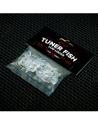 Tuner Fish Lug Locks are small fish-shaped locks, with a star-shaped cavity that grips your drum's tuning rod. The 'tail' of the fish then rests on your hoop, locking the lug lock into place. If you want to use the Tuner Fish Lug Locks on the resonant, rather than the batter head, you can use the included secure bands. Lug Locks are a great way to keep your drums in tune.