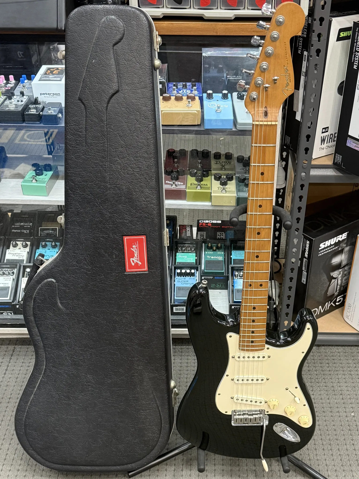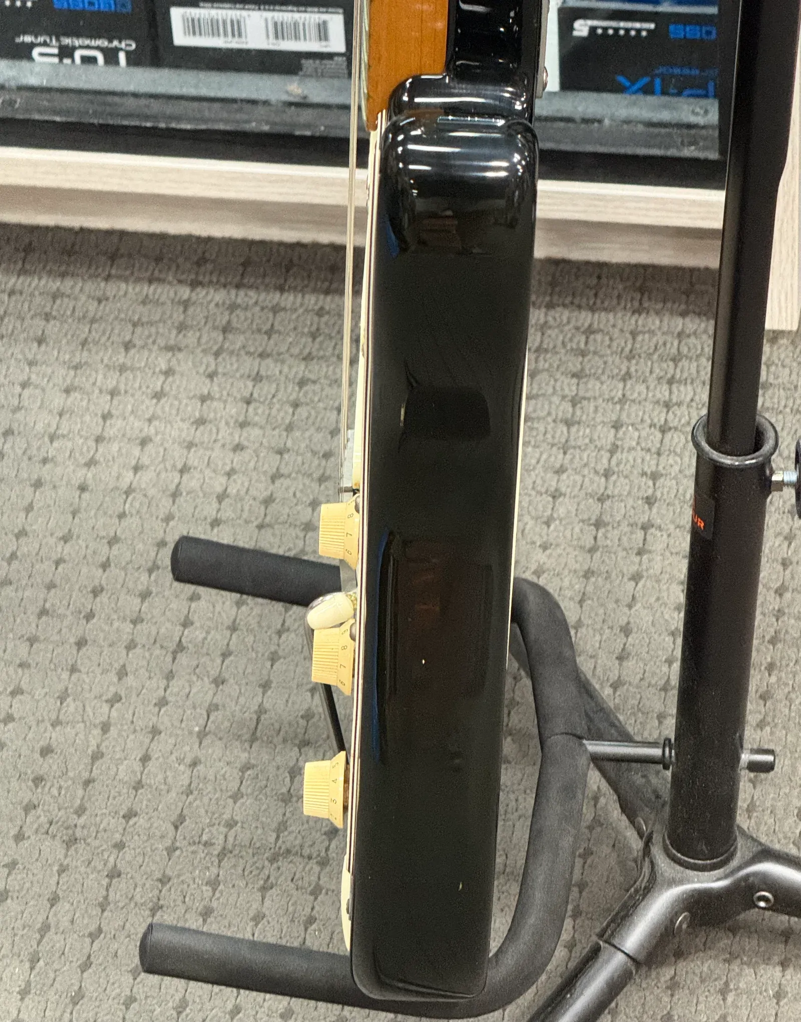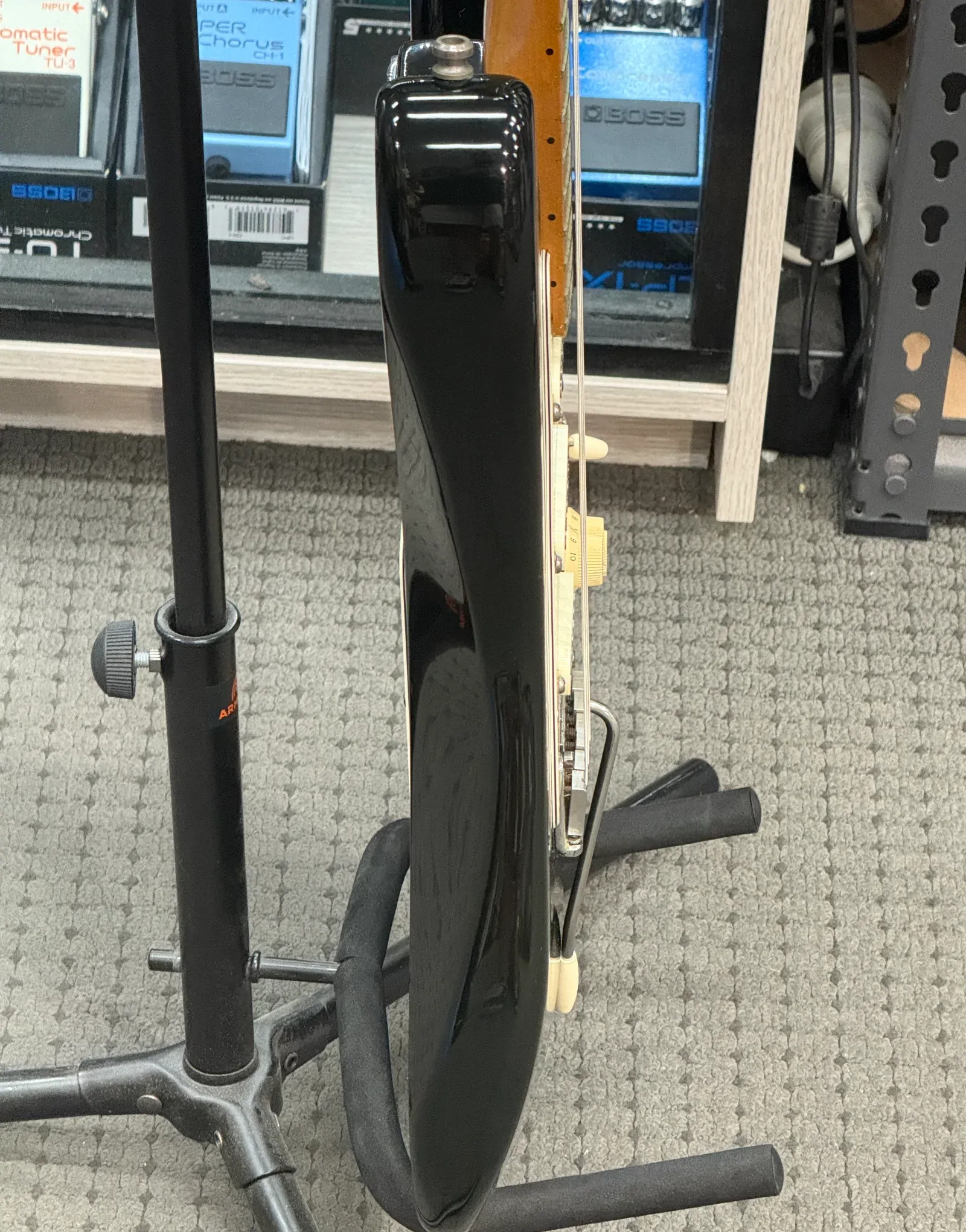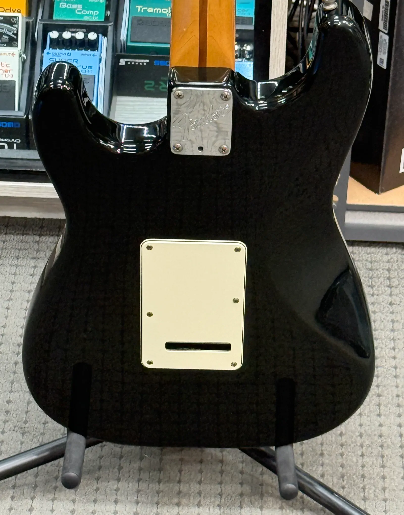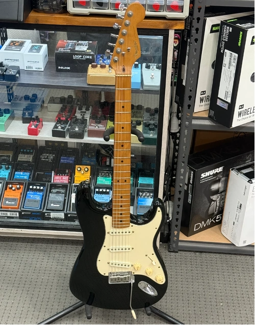 This used 1996 Fender American Standard Stratocaster in black delivers the familiar Stratocaster response with a mid-90s American-made feel that many players value for its consistency and playability. The alder body provides an even tonal foundation, producing a clear low end, focused mids, and a controlled top end that suits clean tones, edge-of-breakup sounds, and pedal-driven setups. A trio of American Standard single-coil pickups in an SSS configuration offers articulate note separation, with the bridge staying bright and defined, the neck remaining rounded and full, and the in-between positions delivering the expected clarity and quack.