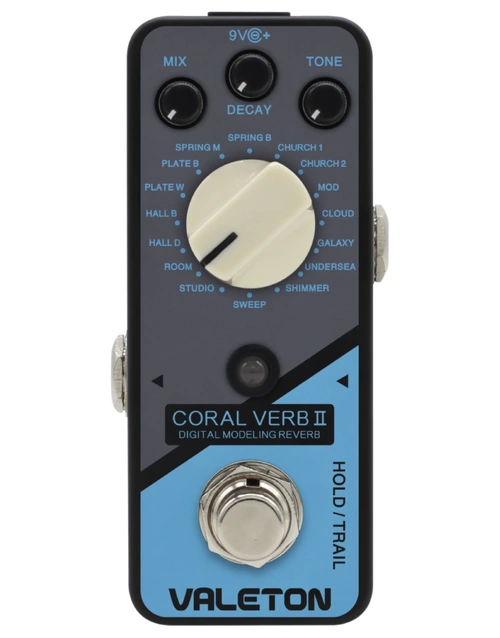Comparing to 1st generation, the all-new Valeton Coral Verb II features advanced 24-bit digital platform, bringing you better sound quality, lower noise and new functions. This multi-use reverb pedal has 16 high quality reverb effects ready for any music style. Plus, a switchable reverb trail is very convenient for any circumstance.