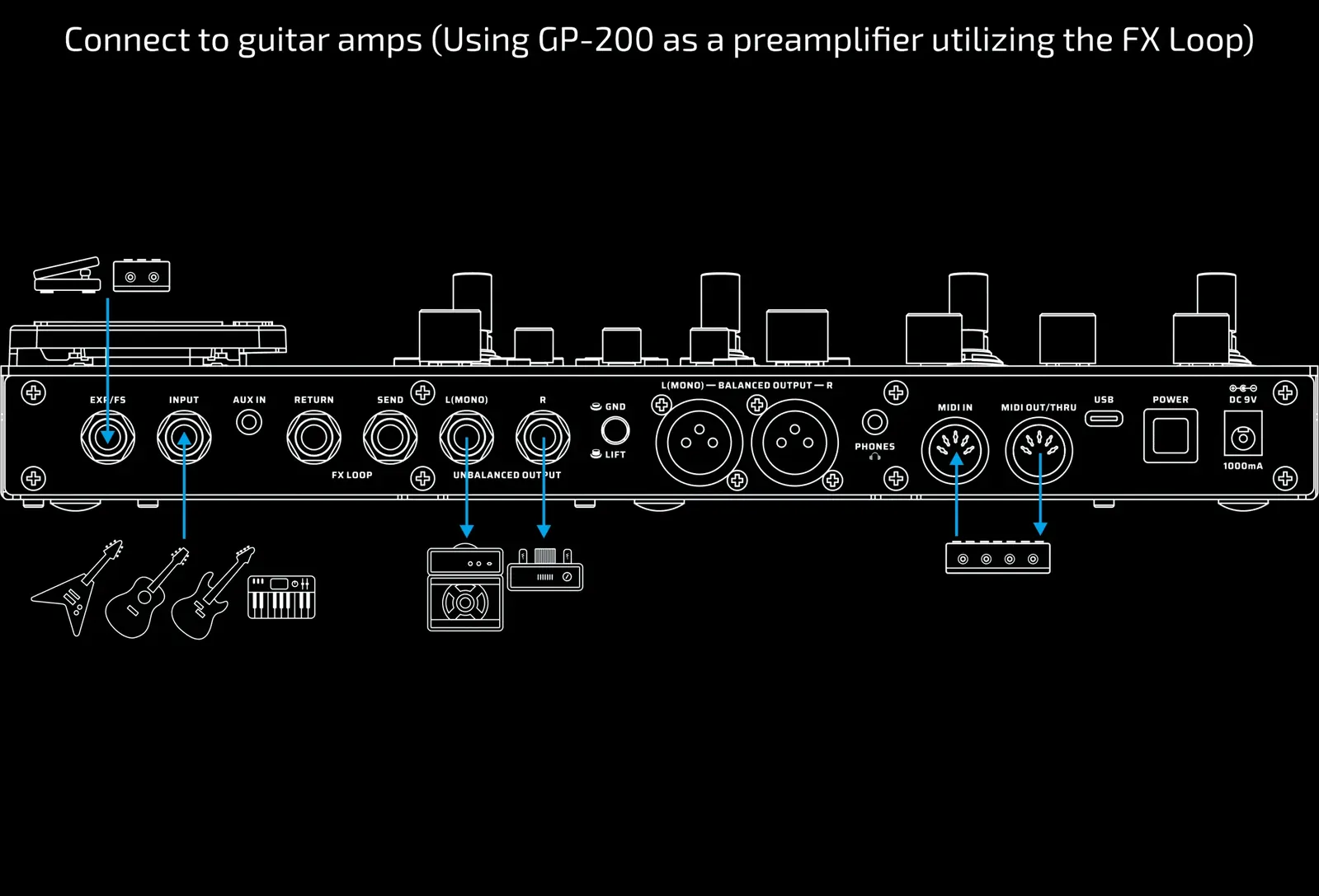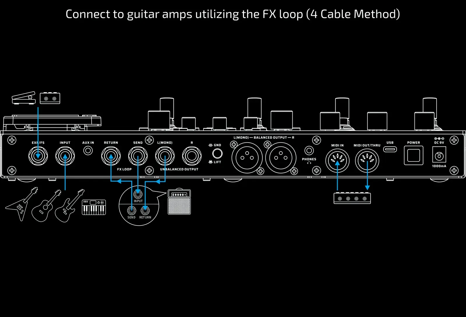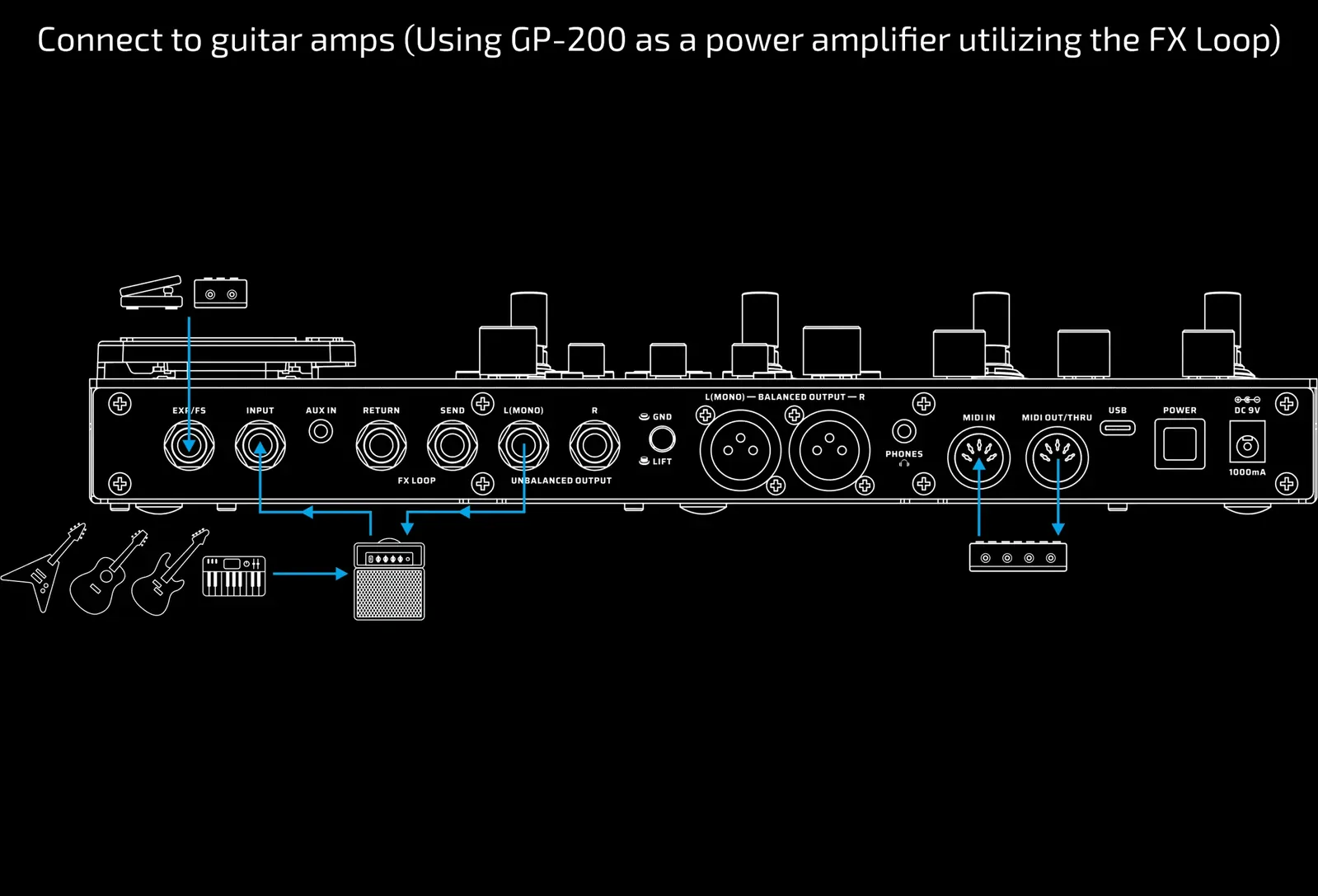 | Built-in expression pedal controlling up to 3 effect parameters |