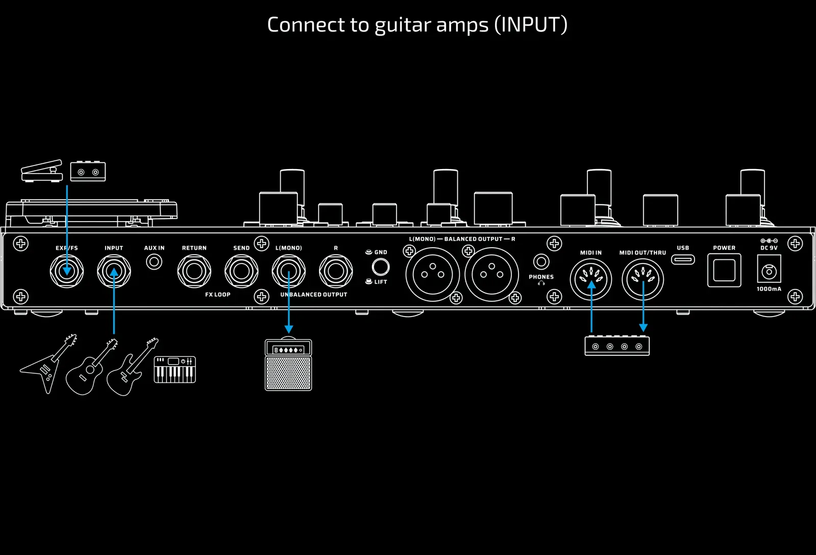 | Built-in expression pedal controlling up to 3 effect parameters |