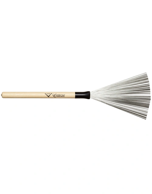 Non-retractable wire brush with 5A sized wooden grip. Features a metal rivet at butt end for cymbal scrapes.