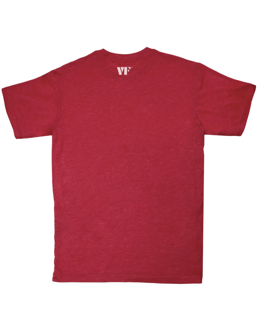 This soft, lightweight t-shirt features a bold front graphic print celebrating the premium craftsmanship of Vic Firth sticks over the past 60 years. A small VF logo under the back collar finishes the design of this heathered red tee. Unisex, relaxed boxy fit, size medium.