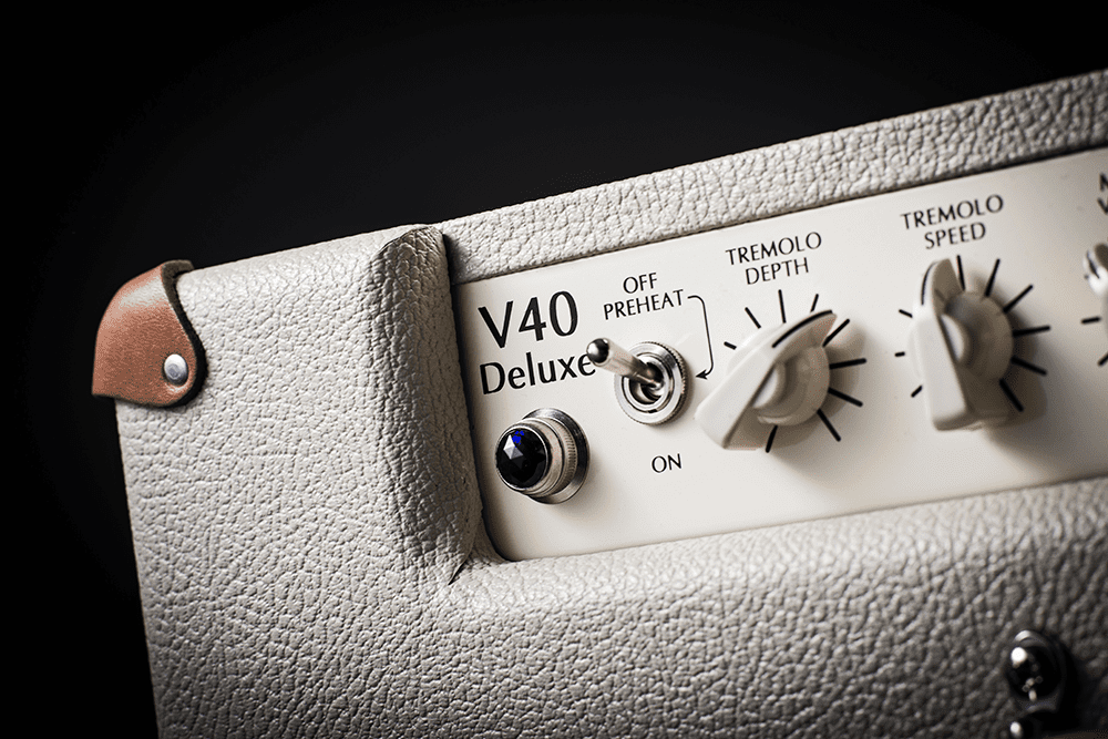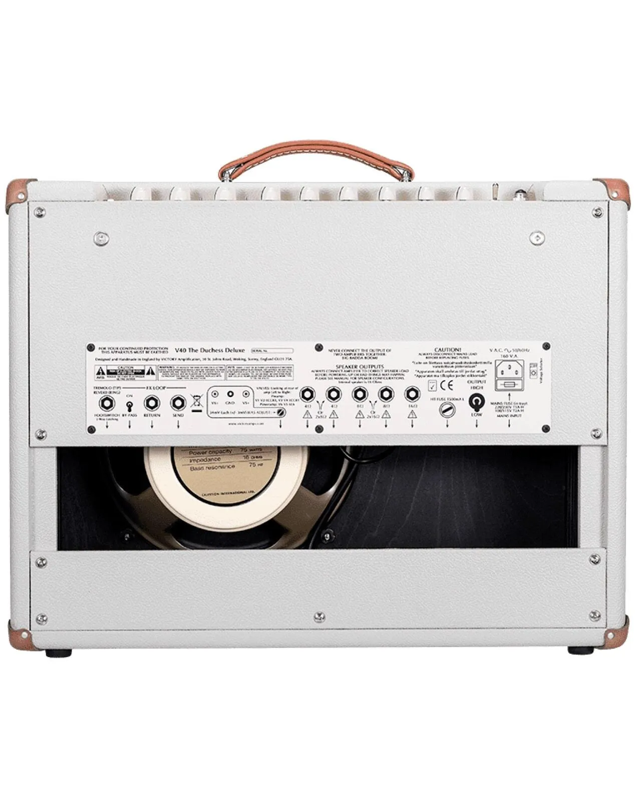 Introducing the Victory V40CDLX The Duchess Deluxe 1x12" 40W Valve Guitar Combo Amp, an evolution of the award-winning V40 The Duchess with valve-driven spring reverb and tremolo, housed in a stunning cream vinyl over traditional wooden cabinet with leather corners and handle. Equipped with a Celestion G12H-75 Creamback speaker, it delivers classic American cleans, pushed tweedy grit, and driven British blues-rock tones. Featuring a single channel with voice switch for versatile tonal options, along with a mid kick control for boosted midrange frequencies. The valve-driven spring reverb and tremolo add vintage-style ambiance, footswitchable for convenience. Switch between full power and low power modes for versatile dynamics, perfect for home, studio, and stage use. With a series effects loop for pedal integration and unique solid pine cabinets for enhanced resonance (note that the baffle and back section is ply), the V40CDLX offers boutique-standard tone and musicality for discerning players.
