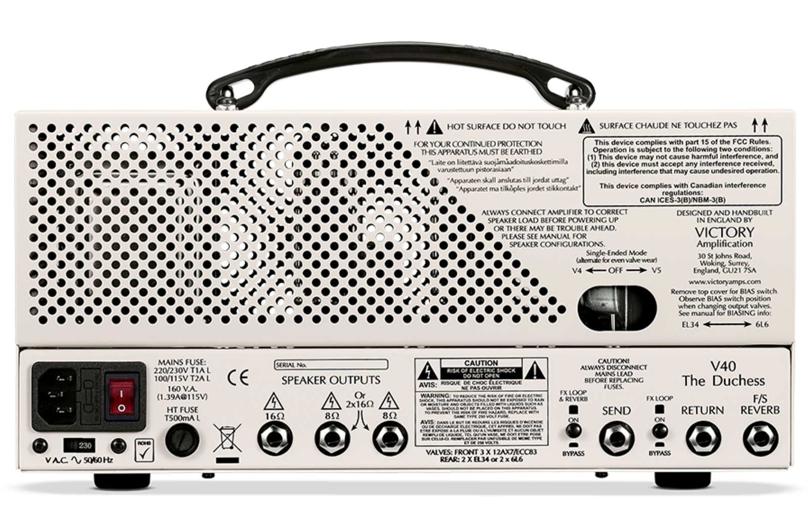| Additional Features | Two-position Voice switch Mid Kick switch Footswitchable digital reverb with hard bypass option Series effects loop with hard bypass Power valves switchable to 6L6 Single-ended mode Skeletonised metal case with rubber handle Padded carry bag included Single-button footswitch for reverb on/off included |