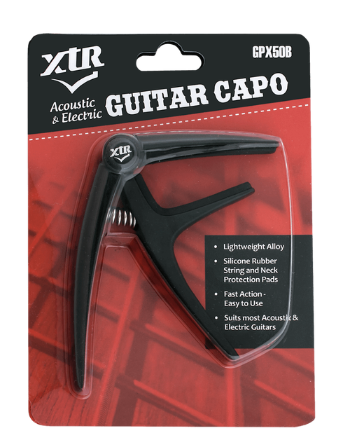 The XTR GPX50B Trigger Style Capo Black is made of lightweight alloy, silicone rubber string and neck protector pads. Fast action. Suits most electric and acoustic guitars.