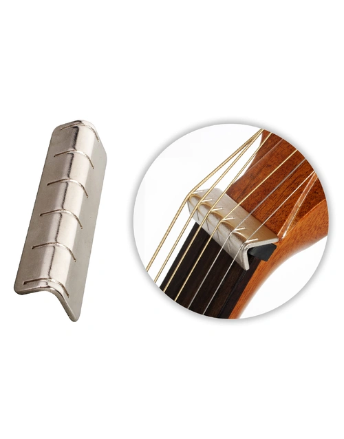 Placed over an acoustic guitar, the nut extender raises the strings for slide playing. 49mm long.