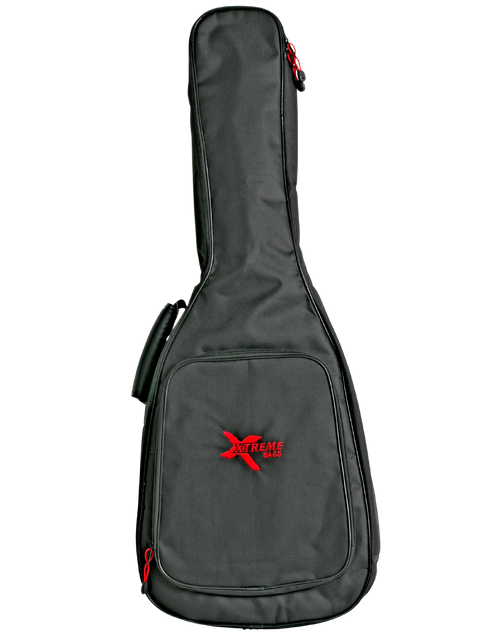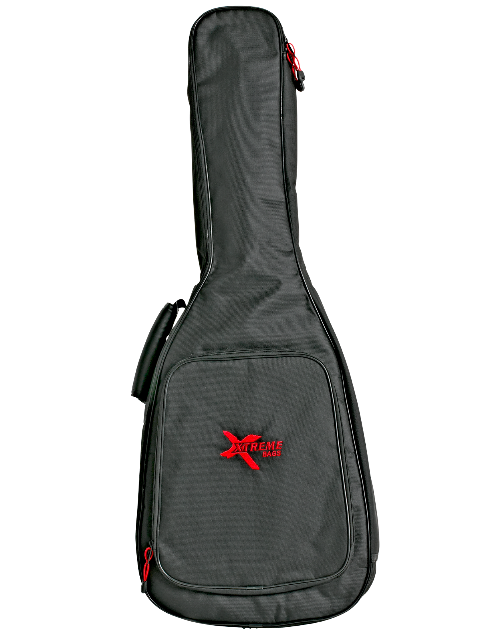 Black heavy duty nylon waterproof yarn. 5mm sponge padded and lined. Reinforced at head- stock and bridge. Full length zip. 1 accessory pocket. Cross stitched cushioned carry handle. 2 adjustable shoulder straps with comfort pads. Rubber tread. Toggles to all zips. Embroidered Xtreme logo.