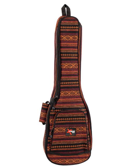 Boho Series 2 baritone ukulele gig bag. Black/orange/burgundy weave pattern fabric. Reinforced interior lining with 10mm foam protective padding. Full length heavy duty zip. Accessory pocket. Stitched in padded carry handle and 2 adjustable, padded back pack straps. Rubber Xtreme logo badge.