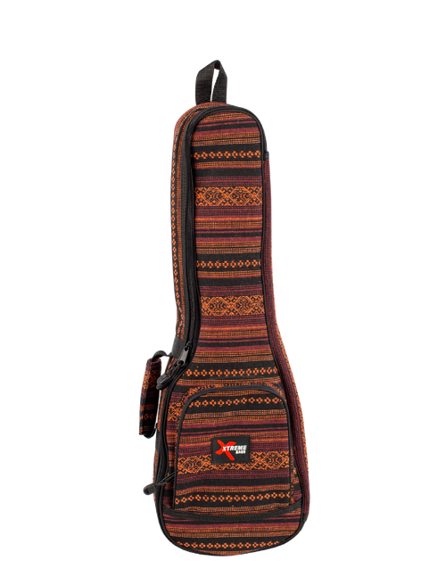 Boho Series 2 concert ukulele gig bag. Black/orange/burgundy weave pattern fabric. Reinforced interior lining with 10mm foam protective padding. Full length heavy duty zip. Accessory pocket. Stitched in padded carry handle and 2 adjustable, padded back pack straps. Rubber Xtreme logo badge.