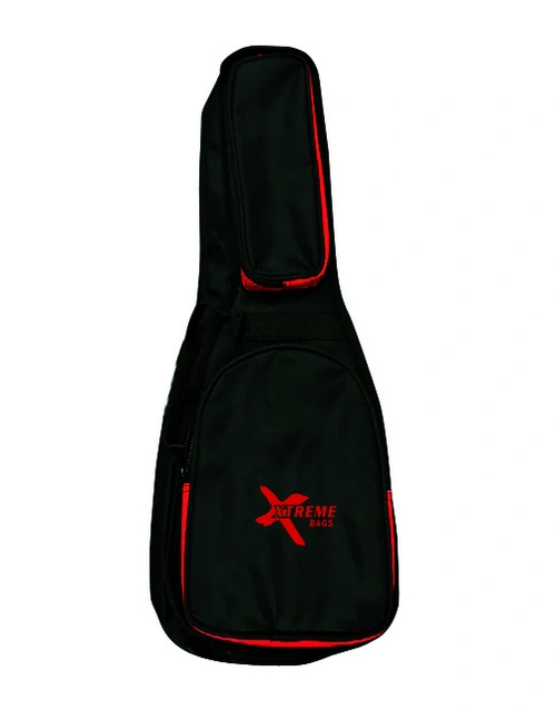 Deluxe series Xtreme concert ukulele bag. Black heavy duty nylon waterproof yarn with red detailed inserts. 5mm sponge padding and lined. Full length zip. 2 accessory pockets. 2 carry handles and red adjustable padded shoulder strap. Embroidered Xtreme logo.
