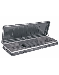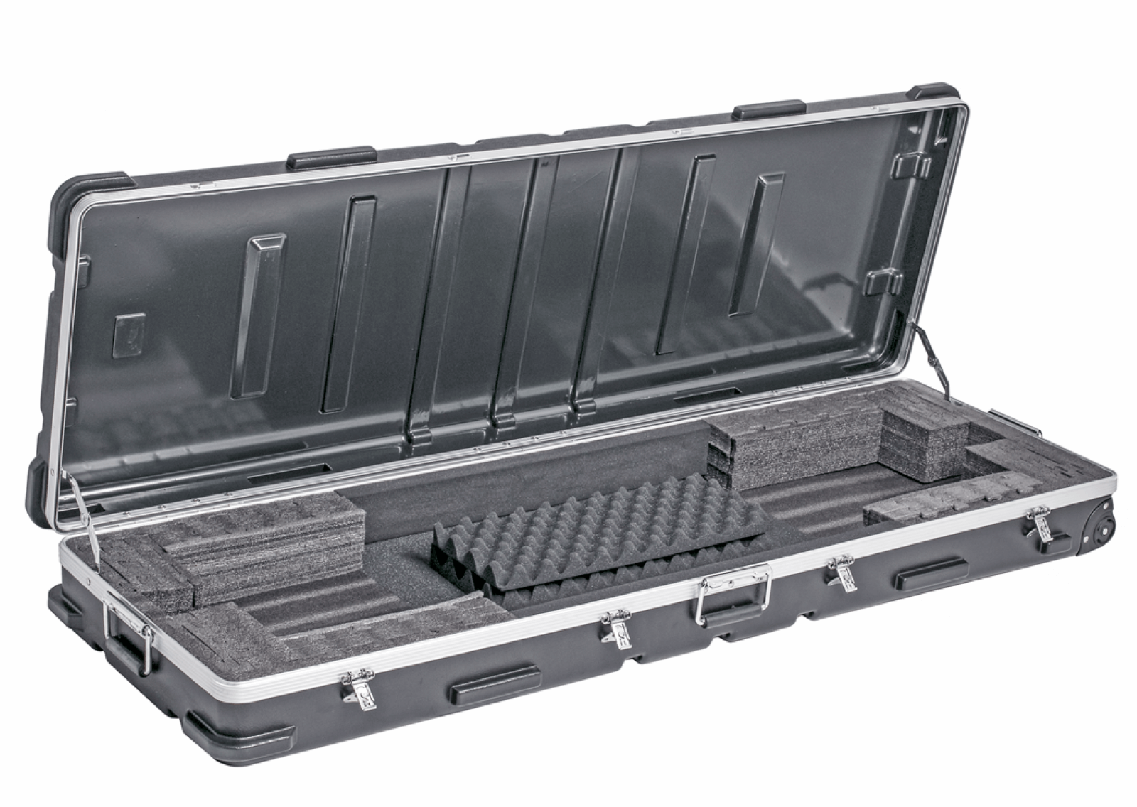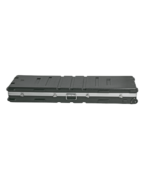 ABS keyboard case with wheels. Suits 88 keys. Moulded shells with aluminium interlocking edges and heavy duty pair of wheels. 4 butterfly catches and heavy duty hinges for extra road strength. Fixed and movable interlocking foam inner blocks with pads to suit various sized keyboards. 148 x 43.8 x 14cm