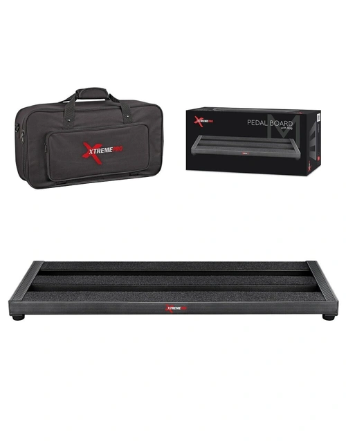 Flat, ergonomic design with 3 crossrail with 1 adjustable middle rail. Allen key included. Lightweight aluminium construction. Crossrails fitted with loop grip tape. Self-adhesive hook tape included to fit your effect units. Non-slip rubber feet. Heavy duty padded nylon gig bag with accessory pocket and shoulder strap. Dimensions: 50cm (W) x 23cm (D) x 3.5cm (H).