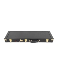Heavy duty plywood covered in black vinyl with orange stitching. Stitched black end caps. Thick foam interior padding. Black plush lined with fitted black protective internal blanket. Covered accessory compartment. Ergonomic imitation leather handle. 3 deluxe gold drawbolt latches and combination lock. Lock can be set to any 3 digit number. Xtreme logo plate.