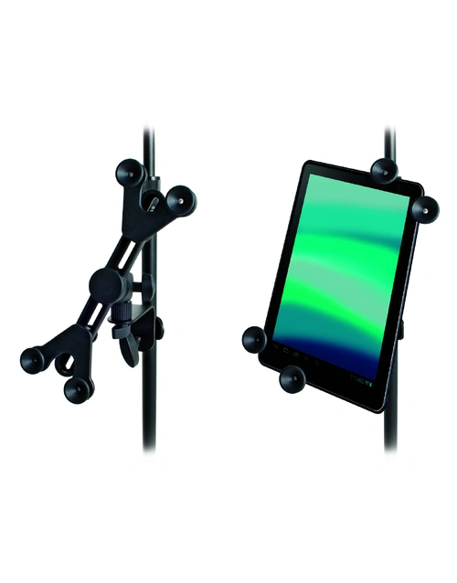 Universal tablet holder. Multi adjustable to suit most tablets with 178-254mm screen size. Bracket and clamp attaches to mic. stand and secures the tablet for easy access and viewing. Tablet holder can also be separated and screwed directly onto microphone desk and floor stands with a 5/8” thread. Suits post diameter up to 25mm.