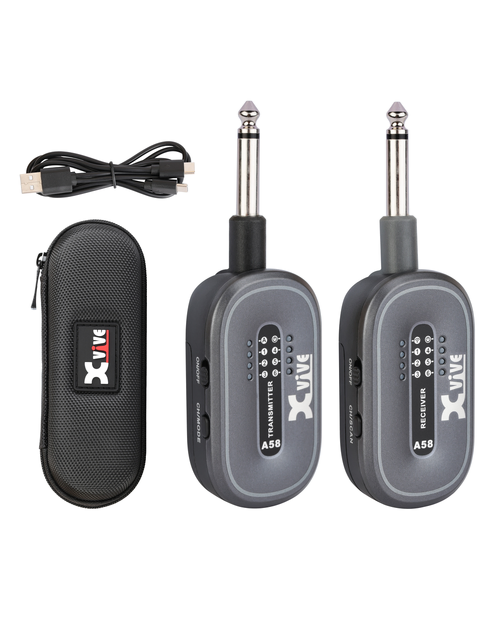 The Xvive A58 Guitar Wireless System offers a reliable and interference-free solution for guitarists and bassists using the 5.8 GHz frequency band. Designed for both active and passive pickups, the A58 automatically scans and selects the most stable channel for optimal performance. With 24-bit/48kHz audio quality, six available channels, and up to five hours of battery life, this system is ideal for stage and rehearsal use. The open-battery-compartment design makes maintenance simple, and the included dual USB-C cable charges both units simultaneously. A rugged carry case is also included for transport and storage.