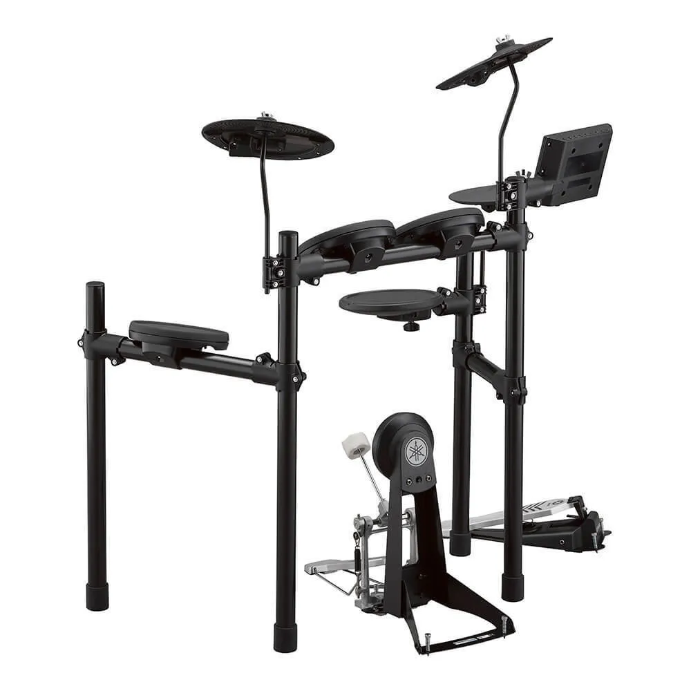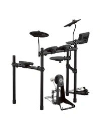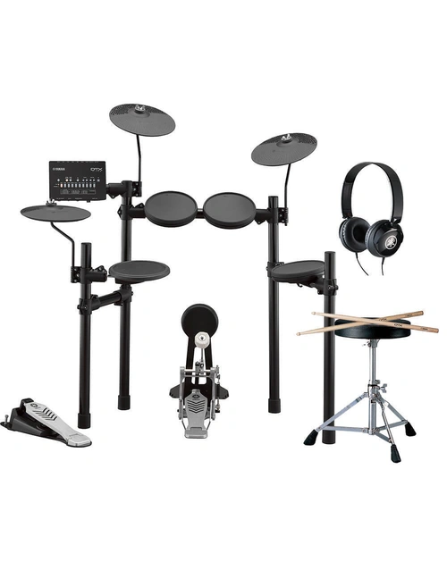 - Includes: Triple-zone snare, 3 tom drums, hi-hat, ride. crash, hi-hat pedal and kick pedal with kick pad