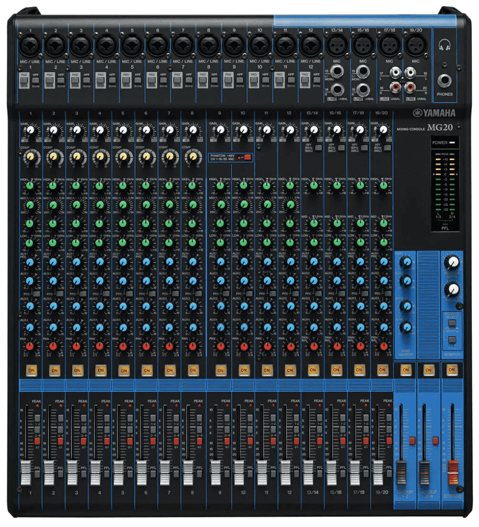 Crafting your unique sound is made easy with the MG20's state-of-the-art functionality borrowed from Yamaha's high-end consoles. The 1-Knob Compressors offer instant access to optimized compression settings, while the 3-band EQ and High-Pass Filters provide precise control over your tone, resulting in a smoother, cleaner mix. With a 20-channel capacity, this mixer accommodates up to 16 microphones and 20 line inputs, including 12 mono and 4 stereo channels. Along with 4 AUX (including FX) and 4 GROUP Buses + 1 Stereo Bus, the Yamaha MG20 offers incredible versatility for any music production setup.