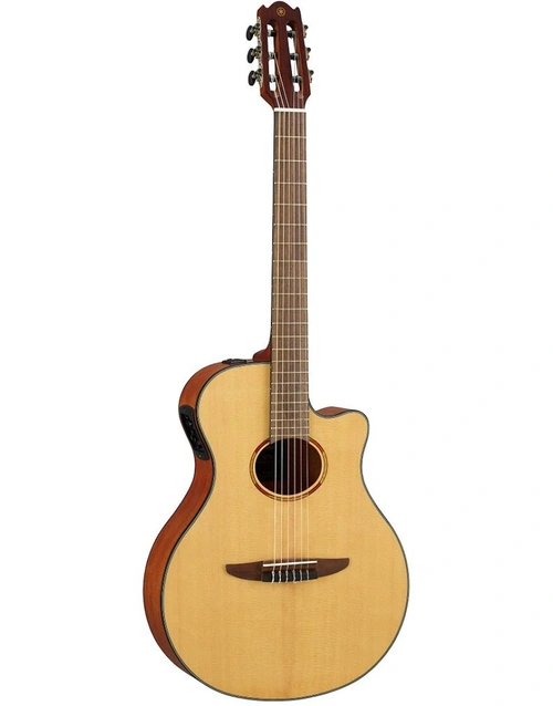 The Yamaha NTX1-NT Solid Top Classical Nylon String Guitar w/ Pickup, finished in Natural, features modern looks and a super comfortable neck profile, allowing electric and steel-string players to dip their toes into the world of classical nylons, with very little adjustment in play style. A solid Sitka spruce top, and Nato back, sides and neck, combined with the advanced pickup and preamp system, ensure that the Yamaha NTX1's naturally resonant and well-balanced tone are represented as well electrically, as they are acoustically.