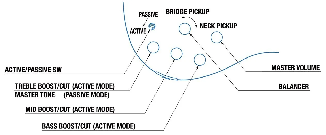 | Controls | Master Volume, Pickup Balancer, 3-Band EQ (Bass, Middle, Treble), Active/Passive Switch |